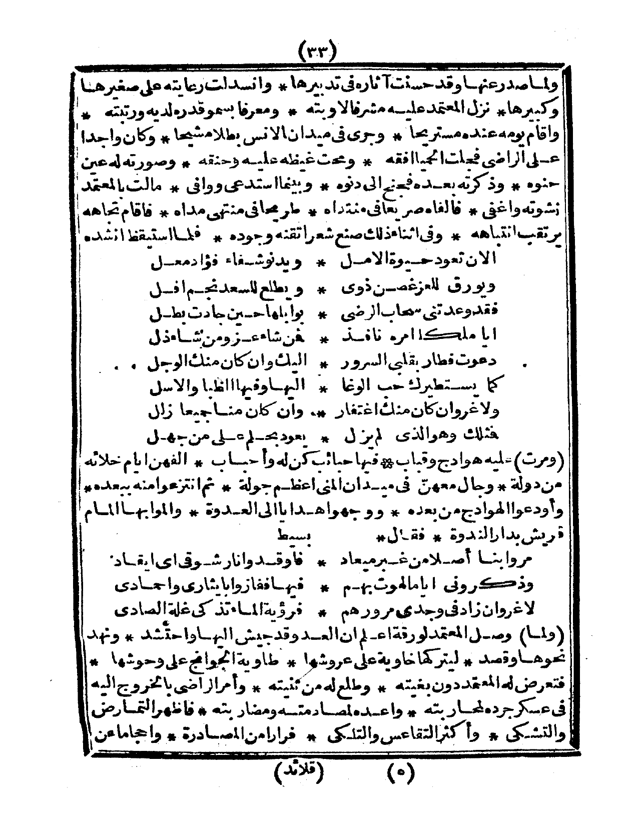 ولما صدر عنها وقد حسنت آثاره في تدبيرها، وانسدلت رعايته على صغيرها وكبيرها، نزل المعتمد عليه مشرفاً لأوبته، ومعرفاً بسمو قدره لديه ورتبته، وأقام يومه عنه مستريحاً، وجرى في ميدان الأنس بطلاً مشيحاً، وكان واجداً على الراضي فجلت الحميا أفقه، ومحت غيظه عليه وحقنه، وصورته له عين حنوة، وذكرته بعده فجنح إلى دنوه، وبينما استدعي ووافى، مالت بالمعتمد نشوته وأغفى، فألفاه صريعاً في منتداه، طريحاً في منتهى مداه، فأقام تجاهه، يرتقب انتباهه، وفي أثناء ذلك صنع شعراً أتقنه وجوده، فلما استيقظ أنشده: متقارب