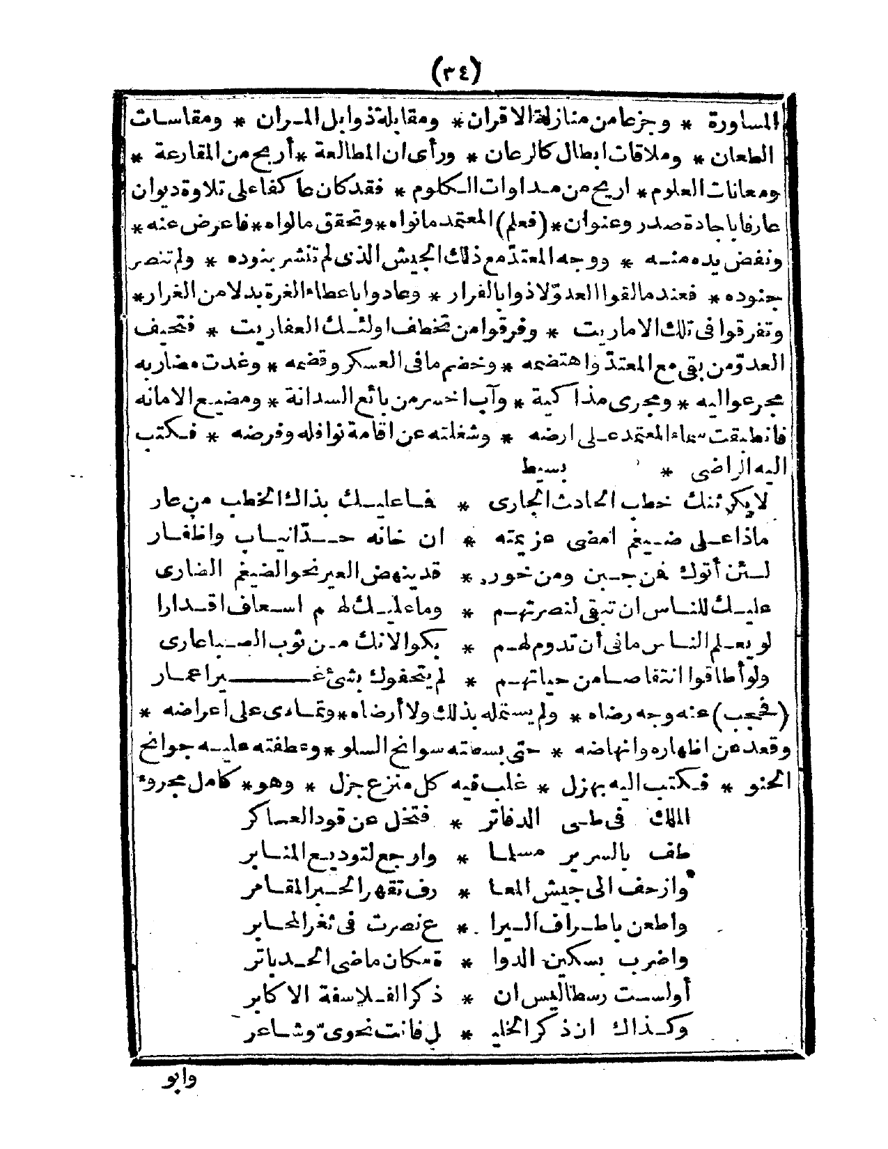 المساورة، وجزعاً من منازلة الأقران، ومقابلة ذوابل المران، ومقاسات الطعان، وملاقات أبطال كالرعان، ورأى أن المطالعة، أربح من المقارعة، ومعانات العلوم، أريح من مداوات الكلوم، فقد كان عاكفاً على تلاوة ديوان، عارفاً بإجادة صدر وعنوان، فعلم المعتمد ما نواه، وتحقق ما لواه، فأعرض عنه، ونفض يده منه، ووجه المعتد مع ذلك الجيش الذي لم تنشر بنوده، ولم تصر جنوده، فعند ما لقوا العدو لاذوا بالفرار، وعادوا بإعطاء الغرة بدلاً من الغرار، وتفرقوا في تلك الأماريت، وفرقوا من تخطف أولئك العفاريت، فتحيف العدو من بقي مع المعتد واهتضمه، وخضم ما في العسكر وقضمه، وغدت مضاربه مجر عواليه، ومجرى مذاكيه، وآب أخسر من بائع السدانة، ومضيع الأمانة، فانطبقت سماء المعتمد على أرضه، وشغلته عن إقامة نوافله وفرضه، فكتب إليه الراضي: بسيط