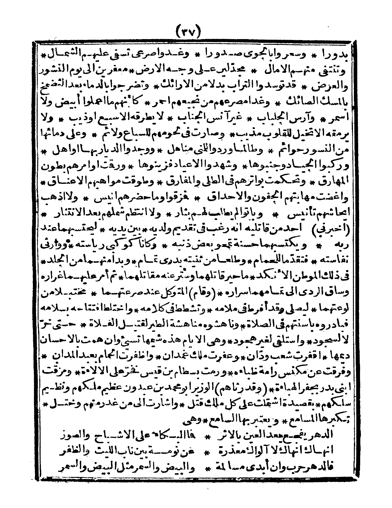 بدوراً، وسعروا بالجوى صدوراً، وغدوا صرعى تسفي عليهم الشمال، وتنفي منهم الآمالا، مجدلين على وجه الأرض، معفرين إلى يوم النشور والعرض، وقد توسدوا التراب بدلاً من الآرائك، وتضرجوا بالدماء بعد التضمخ بالمسك الصائك، وغدا مضرعهم من نجيعهم أحمر، كأنهم ما أعملوا أبيض ولا أسمر، وأرس الجلباب، غير انس الجناب، لا يطرقه إلا سبع أو ذيب، ولا يرمقه إلا تخيل للقلوب مذيب، وصارت في لحومهم للسباع ولائم، وعلى دمائهم من النسور حوائم، وطالما وردوا للمنى مناهل، ووجدوا الديار بها أواهل، وركبوا الجياد وجنبوها، وشهدوا الأعياد فوزينوها، ورقمت أوامرهم بطون المهارق، وتحكمت بواترهم في الطلى والمفارق، وطوقت مواهبهم الأعناق، وأغصت مهابتهم الجفون والأحداق، فمزقوا وما حضرهم أنيس، ولا أذهب إيحاشهم تانيس، وباتوا لم يطلب لهم بثار، ولا انتظم شملهم بعد الانتثار. أخبرني أحد قاتليه أنه رغيب في تقديم ولديه، بين يديه، ليحتسبهما حسنة تمحو بعض ذنبه، وكانا كوكبي رياسته، ووارثي نفاسته، فتقدما للحمام، وطلعا من ثنيته بدري تمام، وبدا منهما من الجلد، في ذلك الموطن الأنكد، ما حير قاتلهما وستر عنه مقاتلهما، ثم أمر عليهما غرارة، وساق الردى إلى تمامهما سراره، وقام المتوكل عند صرعتهما، مختبلاً من لوعتهما، ليصلي وقد أفرط في ملامه، وتشطط في كلامه، واختلط افتتاحه بسلامه، فبادروه بأسنتهم في الصلوة، وناهشوه مناهشة الطير لقتيل الفلاة، حتى خر لا لسجود، واستلقى لغير هجود، وهي الأيام هذه شيمها، تسيء وإن همت بالإحسان ديمها، أفقرت شعب ودان، وعفرت ملك غمدان، وأظفرت الحمام بعبد المدان، وفرقت عن مكنس رامة ظباءة، ورمت بسطام بن قيس مخر على الالآءة، ومزقت أبني بدر بجفر الهباءة، وقد رثاهم الوزير أبو محمد ابن عبدون عظيم ملكهم، ونظيم سلكهم، بقصيدة اشتملت على كل ملك قتل، وأشارت إلى من غدر منهم وختل، تكبرها المسامع، ويعتبر بها السامع، وهي: بسيط