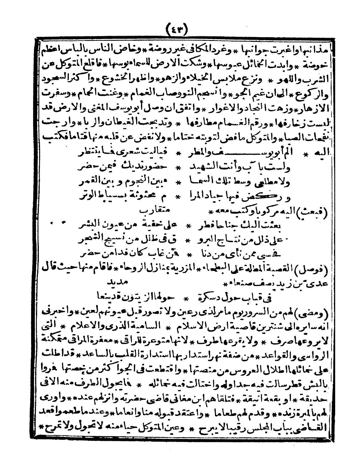 مذانبها، وأغبرت جوانبها، وغرد المكا في غير روضة، وخاض الناس بالباس أعظم خوضه، وأبدت الخمائل عبوسها، وشكت الأرض للسماء بوسها، فأقلع المتوكل عن الشرب واللهو، ونزع ملابس الخيلاء والزهو، وأظهر الخشوع، وأكثر السجود والركوع، إلى ان غيم الجو، وأنسجم النو، وصاب الغمام، وغنت الحمام، وسفرت الأزهار، وزهت النجاد والأغوار، واتفق أن وصل أبو يوسف المغني والأرض قد لبست زخارفها، ورقم الغمام مطارفها، وتدبجت الغطيان والربى، وأرجت نفحات الصبا، والمتوكل ما فض لتوبته ختاماً، ولا نفض عن قلبه منها قتاماً، فكتب إليه: متقارب