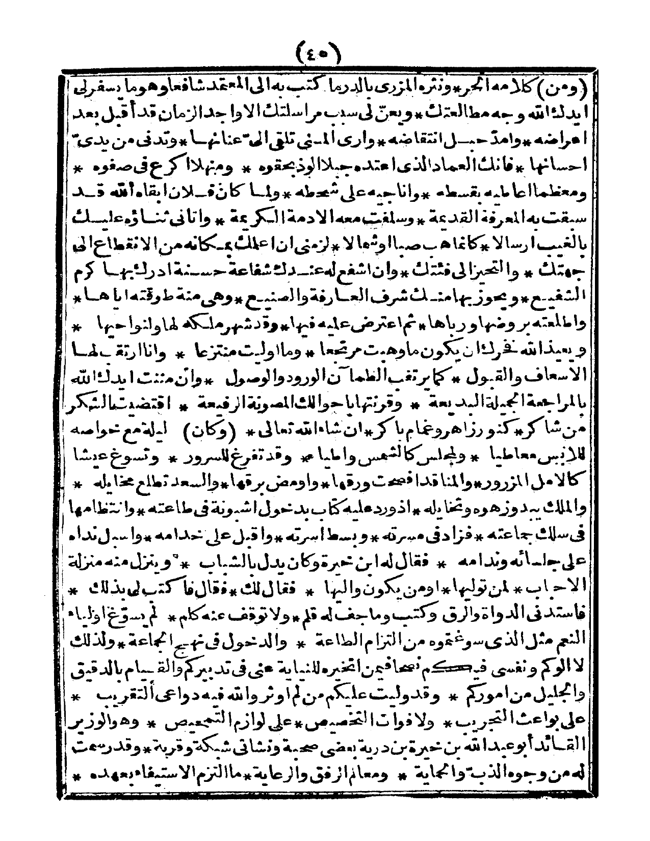 ومن كلامه الحر، ونثره المزري بالدر، ما كتب به إلى المعتمد شافعاً وهو، ما يسفر لي أيدك الله وجه مطالعتك، ويعن لي سبب مراسلتك، إلا واجد الزمان قد أقبل بعد أعراضه، وأمد حبل انتقاضه، وارى المنى تلقي إلي عنانها، وتدني من يدي إحسانها، فإنك العماد الذي اعتده جبلاً الوذ بحقوه، ومنهلاً أكرع في صفوة، ومعظماً أعاطيه بقسطه، أناجيه على شطحه، ولما كان فلان أبقاه الله قد سبقت به المعرفة القديمة، وسلفت معه الأدمة الكريمة، وأتاني ثناؤه عليك بالغيب أرسالاً، كأنما هب صبا أو شمالاً، لزمني أن أعلمك بمكانه من الانقطاع إلى جهتك، والتحيز إلى فئتك، وإن أشفع له عندك شفاعة حسنة أدرك بها كرم الشفيع، ويحوز بها منك شرف العارفة والصنيع، وهي منة طوقته إياها، وأطلعته بروضها ورباها، ثم اعترض عليه فيها، وقد شهر ملكه لها ولنواحيها، ويعيذ الله فخرك أن يكون ما وهبت مرتجعاً، وما أوليت منتزعاً، وأنا ارتقب لها الإسعاف والقبول، كما يرتقب الظمأن الورود والوصول، وإن مننت أيدك الله بالمراجعة الجميلة البديعة، وقرنتها بأحوالك المصونة الرفيعة، وقرنتها بأحوالك المصونة الرفيعة، اقتضيت الشكر من شاكر، كنور زاهر وغمام باكر، إن شاء الله تعالى، وكان ليلة مع خواصه للأنس معاطياً، ولمجلس كالشمس وأطيا، وقد تفرغ للسرور، وتسوغ عيشاً كالأمل المزرور، والمنا قد أفضحت ورقها، وأومض برقها، والسعد تطلع مخائله، والملك يبدو زهوة وتخايله، غذ ورد عليه كتاب بدخول أشبونة في طاعته، وانتظامها في سلك جماعته، فزاد في مسرته، وبسط أسرته، واقبل على خدامه، وأسبل نداه على جلسائه وندامه، فقال له ابن خيرة وكان يدل بالشباب، وينزل منه منزلة الأحباب، لمن توليها، أو من يكون واليها، فقال لك، فقال فاكتب لي بذلك، فاستدنى الدواة والرق وكتب وما جف له قلم، ولا توقف عنه كلم، لم يسوغ أولياء النعم مثل الذي سوغتموه من التزم الطاعة، والدخول في نهج الجماعة، ولذلك لا ألوكم ونفسي فيكم نصحا فيمن أتخيره للنيابة عني في تدبيركم، والقيام بالدقيق والجليل من أموركم، وقد وليت عليكم من لم أوثر والله فيه دواعي التقريب، على بواعث التجريب، ولا فرات التخصيص، على لوازم التمحيص، وهو الوزير القائد أبو عبد الله ابن خيرة ابن درية بعضي صحبة، ونشاتي شبكة وقربة، وقد رسمت له من وجوه الذب والحماية، ومعالم الرفق والرعاية، ما لتزم الاستيفاء بعهده،