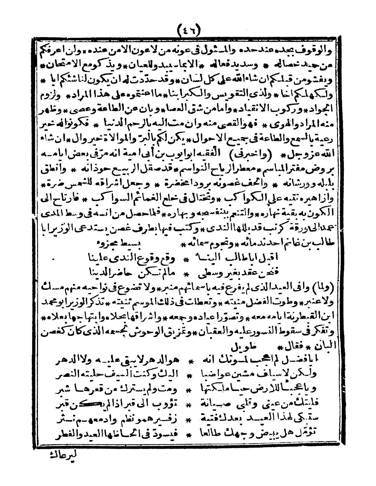 والوقوف بجده عند حده، والمسؤول في عونه من لا عون إلا من عنه، ولن أعرفكم من حميد خصاله، وسديد فعاله، إلا بما سيبدو وللعيان، ويزكو مع الامتحان، ويفشو من قلبكم إن شاء الله على كل لسان، وقد حددت له أن يكون لناشئكم أباً، ولكهلكم أخا، ولذي التقويس والكبر ابنا، ما اعتموه على هذا المراد، ولزوم الجواد، وركوب الانقياد، وأما من شق العصا، وبان عن الطاعة وعصى، وظهر منه المراد والهوى، فهو القصي منه وأن مت إليه بالرحم الدنيا، فكونوا له خير رعية بالسمع والطاعة في جميع الأحوال، يكن لكم بالبر والموالات خير وال، إن شاء الله عز وجل، وأخبروني الفقيه أبو أيوب ابن أبي أمية أنه مر في بعض أيامه بروض مفتر المباسم، معطر الرياح النواسم، قد صقل الربيع حواذته، وانطلق بلبله وورشانه، والحف غصنه بروداً مخضرة، وجعل إشراقه للشمس ضرة، وأزاهيره تتيه على الكواكب، وتختال في خلع الغمائم السواكب، فارتاح إلى الكون به بقية نهاره، والتغم ببنفسجة وبهاره، فلما حصل من أنسه في وسط المدى، عمد إلى ورقة كرنب قد بللها الندى، وكتب فيها بطرف غصن يستدعي الوزير أبا طالب بن غانم أحد ندمائه، ونجوم سمائه: بسيط مجزوء