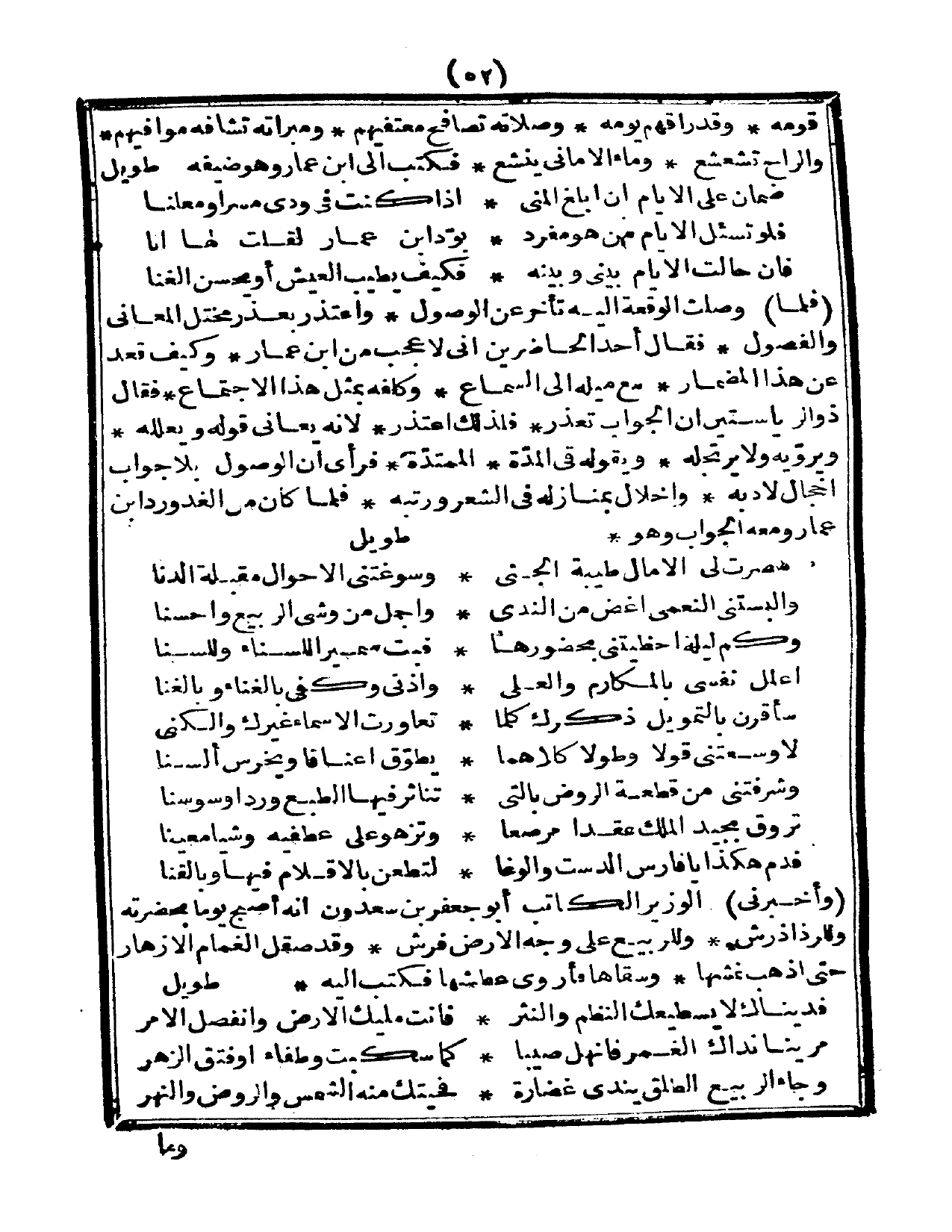 فلما وصلت الرقعة إليه تأخر عن الوصول، واعتذر بعذر مختل المعاني والفصول، فقال أحد الحاضرين أني لا عجب من ابن عمار، وكيف قعد عن هذا المضمار، مع ميله إلى السماع، وكلفه بمثل هذا الاجتماع، فقال ذو الرياستين أن الجواب تعذر، فلذلك اعتذر، لأنه يعاني قوله ويعلله، ويرويه ولا يرتجله، ويقوله في المدة، الممتدة، فرأى أن الوصول بلا جواب إخجال لأدبه، وإخلال بمنازله في الشعر ورتبه، فلما كان من الغد ورد ابن عمار ومعه الجواب وهو: طويل