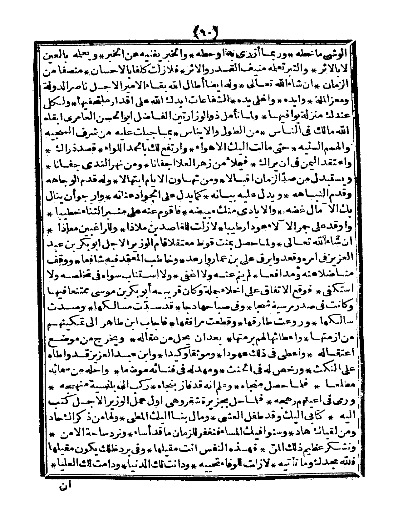 الوشي ما خطه، وربما أزرى به أو حطه، والخبر يغنيه عن الخبر، ويعلمه بالعين لا بالأثر، والتبر تعلمه منيف القدر والأثر، فلا زلت كلفا بالإحسان، منصفاً من الزمان، إن شاء الله تعالى، وله أيضاً، أطال الله بقاء الأمير الأجل ناصر الدولة ومعز الملة، وأيده، وأعلى يده، الشفاعات أيدك الله على أقدار ملتحفيها، ولكل عندك منزلة يوافيها، ولما تأمل ذو الوزراتين الفاضل أبو الحسن العامري أبقاه الله مالك في الناس، من الطول والإيناس، بما جلبت عليه من شرف السجية، والهمم السنية، حتى مالت إليك الأهواء، وارتفع لك بالحمد اللواء، قصد ذراك، واعتقد اليمن في أن يراك، فيملأ من زهر العلي أجفانا، ومن نهر الندى جفانا، ويستبدل من صد الزمان إقبالا، ومن تهاون الأيام ابتهالا، وله قدم الوجاهة، وقدم النباهة، ويدل عليه بيانه، كما يدل على الجواد عنانه، وأرجو أن ينال بك الآمال غضة، والأيادي منك مبيضة، فأقوم عنه على منبر الثناء خطيبا، وأوقد على جمر الآلاء عودا رطيبا، لازلت للقاصدين ملاذا، وللراغبين معاذا، إن شاء الله تعالى، ولما حصل بمنت قوط معتقلا قام الوزير الأجل أبو بكر بن عبد العزيز في أمره وقعد وأبرق على ابن عمار وأرعد وخاطب المعتمد فيه شافعا، ووقف مناضلاً عنه ومدافعا، لم ينم عنه ولا أغفى، ولا استناب سواه في تخلصه ولا استكفى، فوقع الاتفاق على إخلاء جملة وكان قريبه أبو بكر بن موسى ممتنعا فيها وكانت في صدر مرسية شجا، وفي صباحها دجا، قد سدت مسالكها، وصدت سالكها، وروعت طارقها، وقطعت مرافقها، فأجاب ابن طاهر إلى تمكينهم من أزمتها، وإعطائها لهم برمتها بعد أن يحل من عقاله، ويخرج من موقع اعتقاله، وأعطى في ذاك عهودا، وموثقا وكيدا، وابن عبد العزيز قد واطاه على النكث، ورخص له في الخنث، ومهد له في فنائه موضعا، وأحله من سمائه مطلعا، فلما، حصل منجاه، وعلم أنه قد فاز بنجاه، ركب إلى بلنسية متجه، ورمى في أعينهم رهجه، فلما حل بجزيرة شقر وهي أول عمل الوزير الأجل كتب إليه، كتابي إليك وقد طفل العشي، ومال بنا إليك المطي، ولها من ذكراك حاد، ومن لقياك هاد، وسنوافيك المساء، فنغفر للزمان ما قد أساء، ونرد ساحة الأمن، ونشكر عظيم ذلك المن، فهذه النفس أنت مقيلها، وفي برد ظلك يكون ملقيها، فلله مجدك وما تأتيه، لازلت للوفاء تحييه ودانت لك الدنيا، ودامت لك العليا،