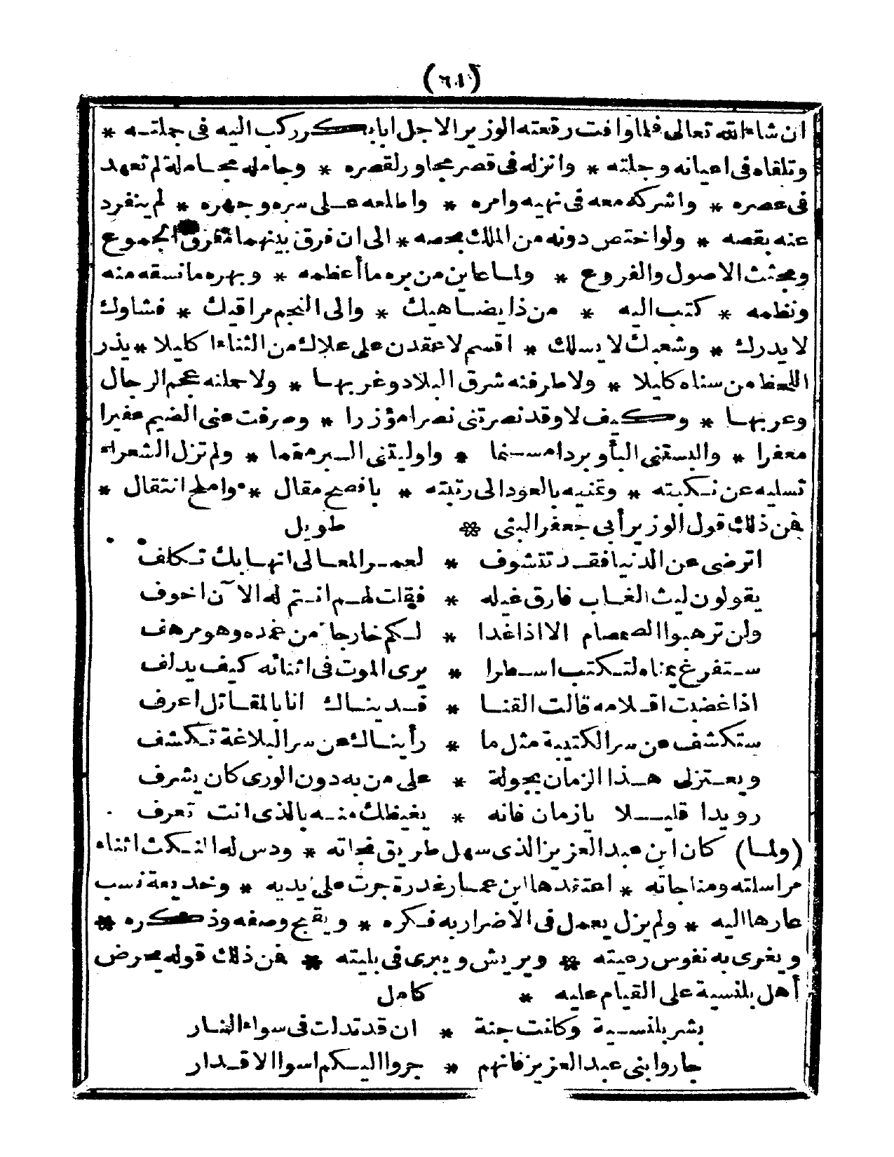 إن شاء الله تعالى، فلما وافت رقعته الوزير الأجل أبا بكر ركب إليه في جملته، وتلقاه في أعيانه وجلته، وأنزل في قصر مجاور لقصره، وجامله مجاملة لم تعهد في عصره، وأشركه معه في نهيه وأمره، وأطلعه على سره وجهره، لم ينفرد عنه بقصة، ولا اختص دونه من الملك بحصة، إلى أن فرق بينهما مفرق الجموع، ومجثث الأصول والفروع، ولما عاين من بره ما أعظمه، وبهره ما نسقه منه ونظمه، كتب إليه، من ذا يضاهيك، وإلى النجم مراقيك، فشاوك لا يدرك، وشعبك لا يسلك، اقسم لأعقدن على علاك من الثناء إكليلا، يذر اللحظ من سناه كليلا، ولأطوفنه شرق البلاد وغربها، ولا حملنه عجم الرجال وعربها، وكيف لا وقد نصرتني نصرا مؤزرا، وصرفت عني الضيم عفيرا معفرا، وألبستني البأو بردا مسنما، وأوليتني البر متمما، ولم تزل الشعراء تسليه عن نكبته، وتمنيه بالعودة إلى رتبته، بأفصح مقال: وأملح انتقال: فمن ذلك قول الوزير أبي جعفر البني، طويل