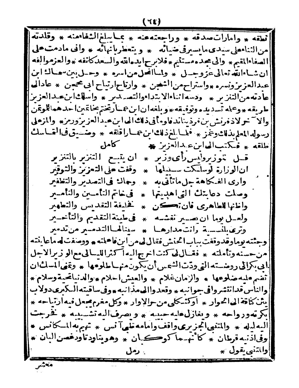 نظفه، وإمارات صدقه، وراجعته عنه، بما يبلغ الشفاء منه، وقلدته من الثناء على سيد ما يسير في ضيائه، ويتعطر بانهائه، وإني ما دمت على الصفاء لمقيم، وإلى مجده مبستنيم، فلا برح أيده الله والسعد كانفه، والعز موالفه، إن شاء الله عز وجل، ولما انحل من أسره، وحل بين سماك ابن عبد العزيز ونسره، واستراح من الشجن، وارتاح ارتياح أبي محجن، عاد إلى عاداته من التنزير، ودسه أثناء الابتداء والتصدير، وأسلك ابن عبد العزيز طريقه، وعلمه تسديده وتوفيقه، وبلغه أن ابن عمار تختم بخاتمين أحدهما للمؤتمن والأخر لأذفرنش بن فرذيناند فأوى في ذلك إلى ابن عبد العزيز ورمز وألمز على رسوله المعلم بذلك وغمز، فلما بلغ ذلك ابن عمار أقلقه، وضيق في التماسك طلقه، فكتب إلى ابن عبد العزيز، كامل