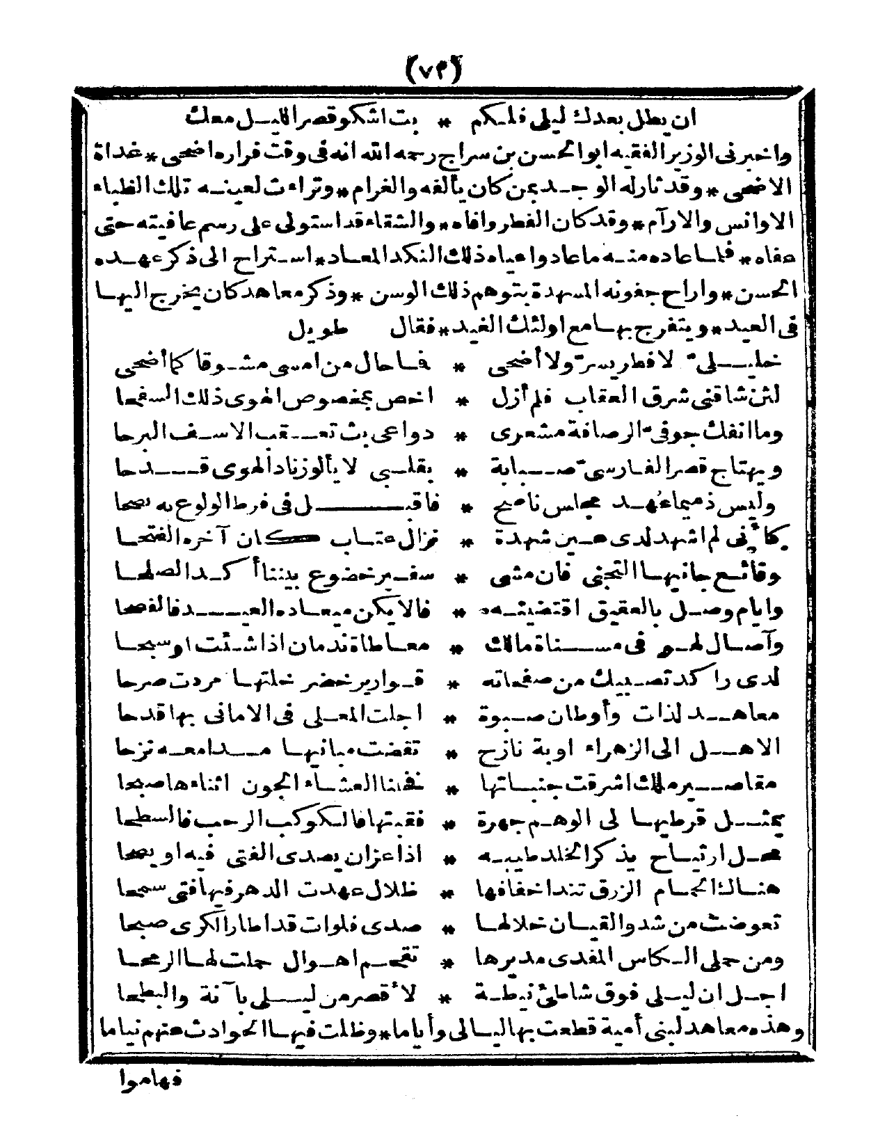 وأخبرني الوزير الفقيه أبو الحسين ابن سراج رحمه الله أنه في وقت فراره أضحى، غداة الأضحى، وقد ثار له الوجد بمن كان يألفه والغرام، وتراءت لعينه تلك الظباء الأوانس والأرام، وقد كان الفطر وافاه، والشقاء قد استولى على رسم عافيته حتى عفاه، فلما عاده منه ما عاد، وأعياه ذلك النكد المعاد، استراح إلى ذكر عهده الحسن، وأراح جفونه المسهدة بتوهم ذلك الوسن، وذكر معاهد كان يخرج إليها في العيد، ويتفرج بها مع أولئك الغيد، فقال: طويل