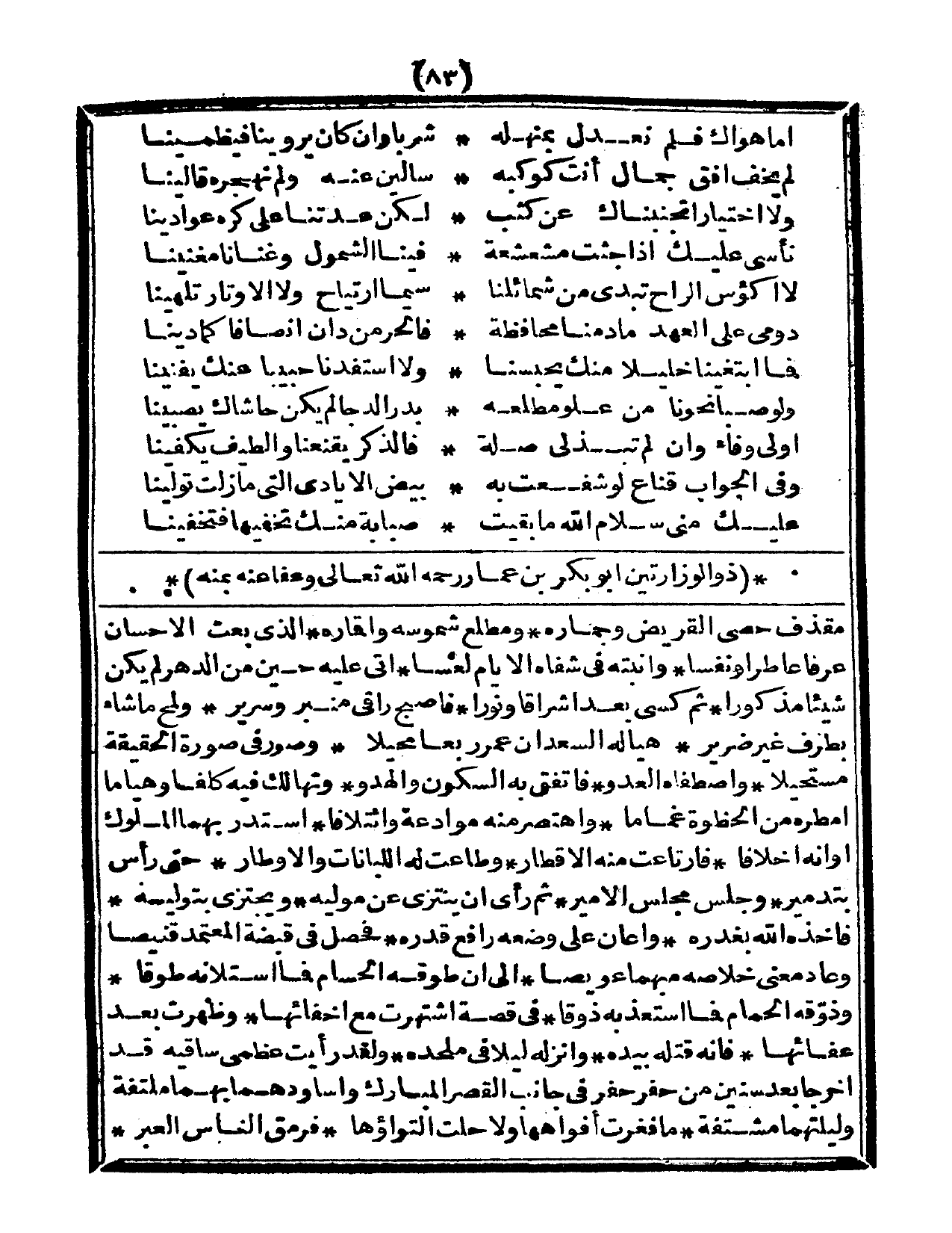 مقذف حصى القريض وجماره، ومطلع شموسه وأقماره، الذي بعث الإحسان عرفاً عاطرا ونفسا، وأنبته في شفاه الأيام لعسا، أتى عليه حين من الدهر لم يكن شيئا مذكورا، ثم كسي بعد إشراقا ونورا، فأصبح راقي منبر وسرير، ولمح ما شاء بطرف غير ضرير، هيا له السعد أن عمر ربعا محيلا، صور في صورة الحقيقة مستحيلا، واصطفاه العدو، فاتفق به السكون والهدو، تهالك فيه كلفا وهياما، وأمطره من الخطوة غماما، واهتصر منه موادعة وايتلافا، استدر بهما الملوك أو أنه أخلافا، فارتاعت منه الأقطار، وطاعت له اللبانات والأوطار، حتى رأس بتدميره، وجلس مجلس الأمير، ثم رأى أن ينتزي عن موليه، ويجتزي بتوليه، فأخذه الله بغدره، وأعان على وضعه رافع قدره، فحصل في قبضة المعتمد قنيصا، وعاد معنى خلاصة مبهما عويصا، إلى أن طوقه الحسام فما استلانه طوقا، وذوقه الحمام فما استعذبه ذوقا، في قصة اشتهرت مع أخفائها، وظهرت بعد عفائها، فإنه قتله بيده، وأنزله ليلا في ملحده، ولقد رأيت عظمي ساقيه قد أخرجا بعد سنين من حفر حفر في جانب القصر المبارك وأساودهما بهما ملتفة، ولبلتهما مشتفة، ما فغرت أفواهها، ولا حلت التواءها، فرمق الناس العبر،
