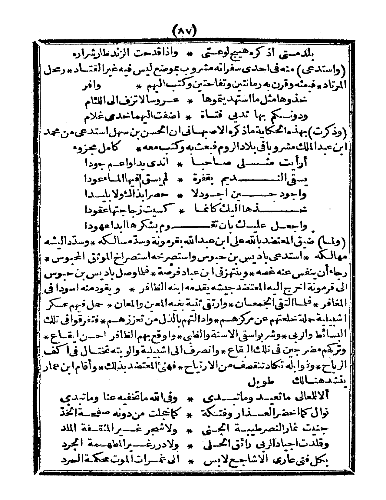 وذكرت بهذه الحكاية ما ذكره الأصبهاني أن الحسن بن سهل استدعى من محمد بن عبد الملك مشروبا في بلاد الروم فبعث به وكتب معه: كامل مجزوء