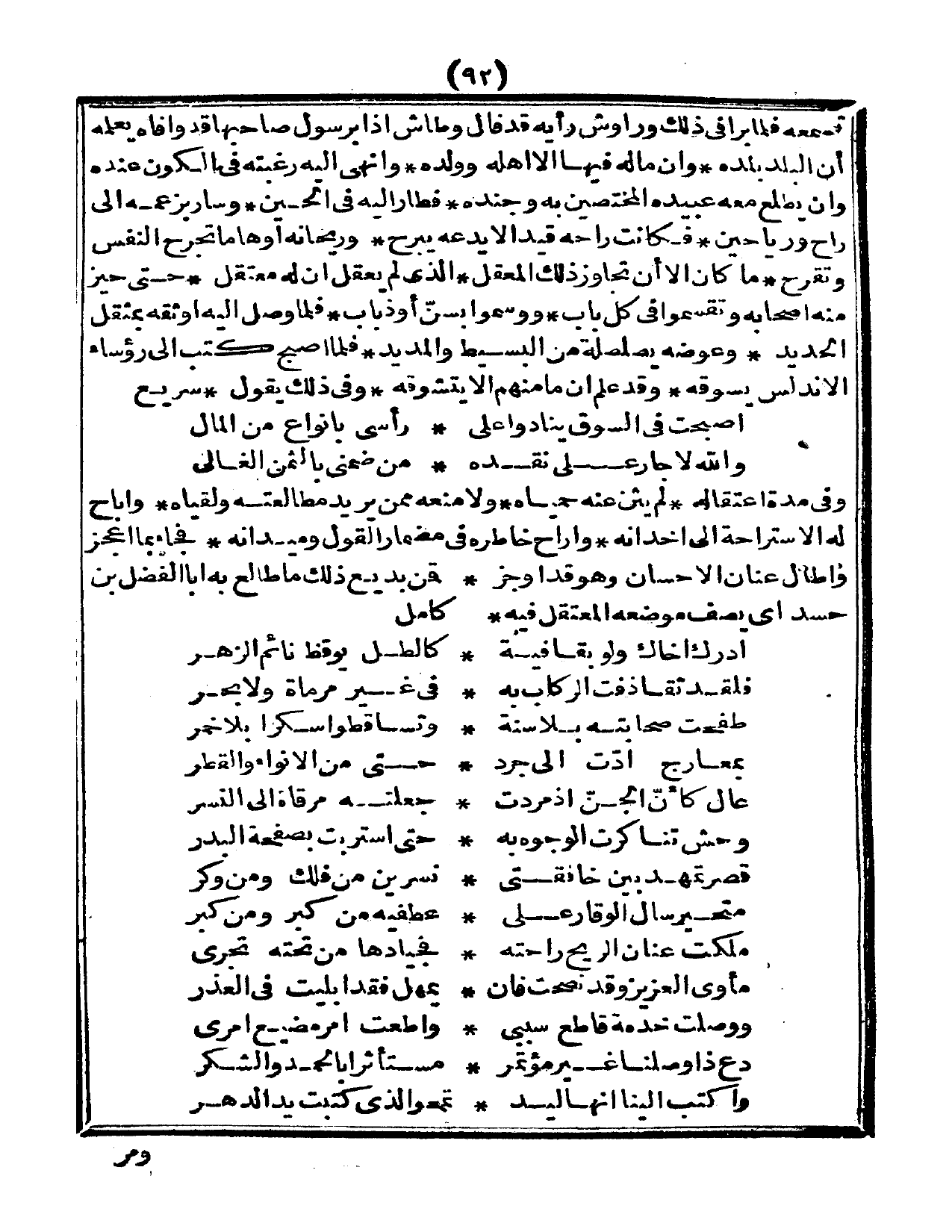 تسمعه، فلما برا في ذلك وراش، ورأيه قد فال وطاش، إذا برسول صاحبها قد وافاه يعلمه أن البلد بلده، وأن ماله فيها إلا أهله ولده، وأنهى إليه رغبته في الكون عنده، وأن يطلع معه عبيدة المختصين به وجنده، فطار إليه في الحين، وسار بزعمه إلى راح ورياحين، فكانت راحه قيداً لا يدعه يبرح، وريحانه أوهاماً تجرح النفس وتقرح، ما كان إلا أن تجاوزوا ذلك المعقل، الذي لم يعقل أن له معتقل، حتى حيز منه أصحابه وتقسموا في كل باب، ووسموا بسن أو ذباب، فلما وصل إليه أوثقه بمثقل الحديد، وعوضه بصلصلته من البسيط والمديد، فلما أصبح كتب إلى رؤساء الأندلس يسوه، وقد علم أن ما منهم إلا يتشوقه وفي ذلك يقول: سريع