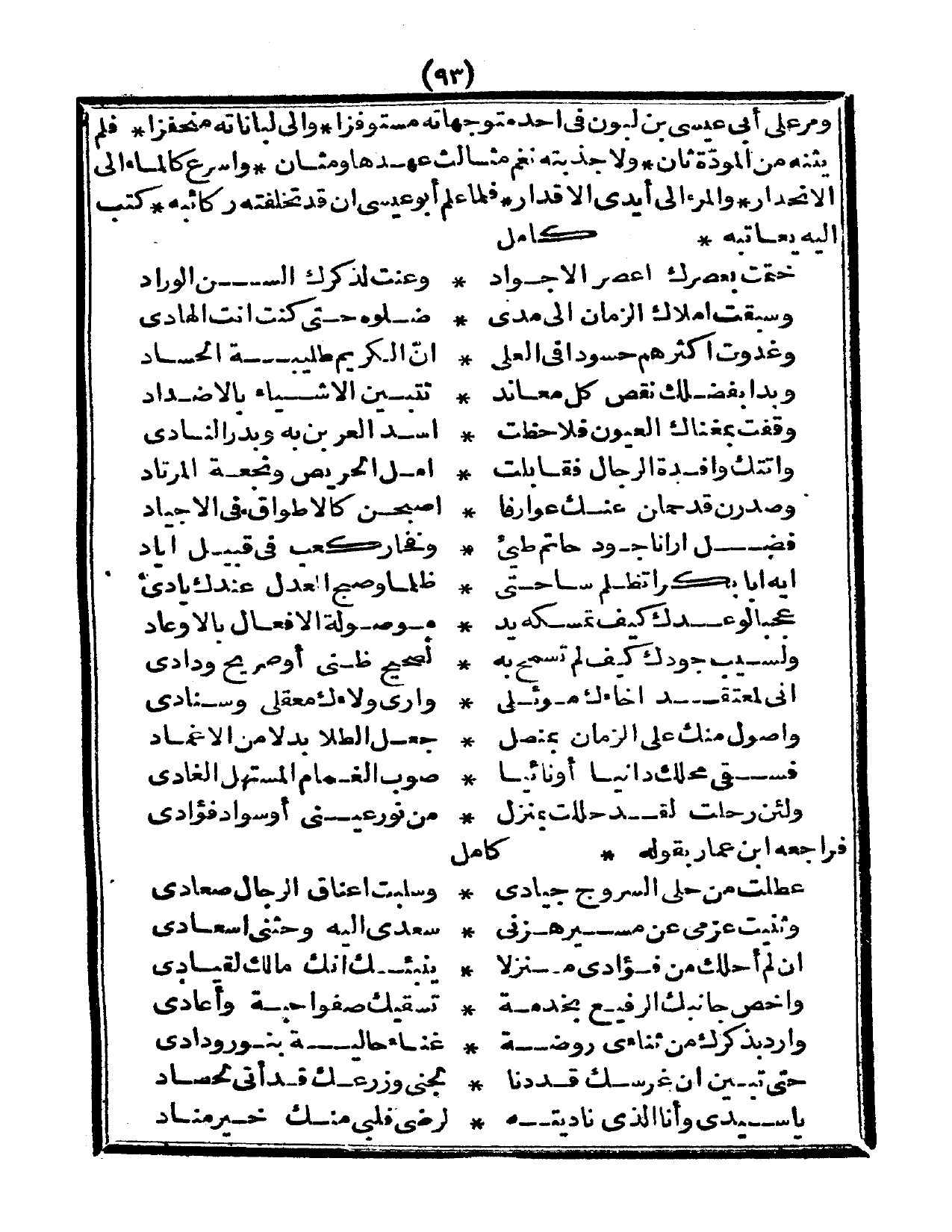 ومر على أبي عيسى ابن لبون في أحد متوجهاته مستوفزاً، وإلى لباناته منحفزاً، وفلم يثنه المودة ثان، ولا جذبته نغم مثالث عهدها ومثان، وأسرع كالماء إلى الانحدار، والمرء إلى أيدي الأقدار، فلما علم أبو عيسى أن تخلفته ركائبه، كتب إليه بعاتبه: كامل