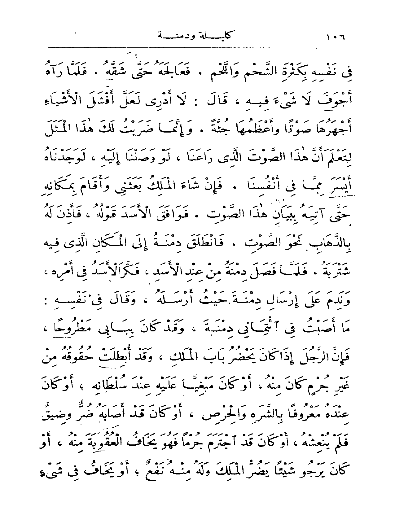 في نفسه بكثرة الشحم واللحم. فعالجه حتى شقه. فلما رآه أجوف لا شيء فيه، قال: لا أدري لعل أفشل الأشياء أجهرها صوتاً وأعظمها جثةً. وإنما ضربت لك هذا المثل لتعلم أن هذا الصوت الذي راعنا، لو وصلنا إليه، لوجدناه ايسر مما في أنفسنا. فإن شاء الملك بعثني وأقام بمكانه حتى آتيه ببيان هذا الصوت. فوافق الأسد قوله، فأذن له بالذهاب نحو الصوت. فانطلق دمنة إلى المكان الذي فيه شتربة. فلما فصل دمنة من عند الأسد، فكر الأسد في أمره، وندم على إرسال دمنة حيث أرسله، وقال في نفسه: وأصبت في ائتماني دمنة، وقد كان ببابي مطروحاً، فإن الرجل إذا كان يحضر باب الملك، وقد أبطلت حقوقه من غير جرمٍ كان منه، أو كان مبغياً عليه عند سلطانه؛ أو كان عنده معروفاً بالشره والحرص، أو كان قد أصابه ضرٌ وضيقٌ فلم ينعشه، أو كان قد اجترم جرماً فهو يخاف العقوبة منه، أو كان يرجو شيئاً يضر الملك وله منه نفع؛ أو يخاف في شيءٍ