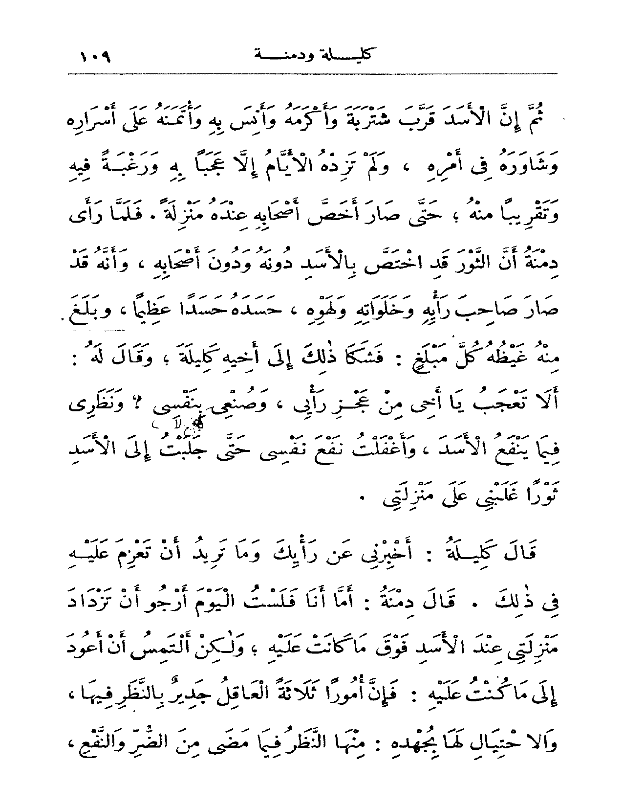 ثم إن الأسد قرب شتربة وأكرمه وأنس به وأتمنه على أسراره وشاوره في أمره، ولم تزده الأيام إلا عجباً به ورغبةً فيه وتقريباً منه؛ حتى صار أخص أصحابه عنده منزلةً. فلما رأى دمنة أن الثور قد اختص بالأسد دونه ودون أصحابه، وأنه قد صاد صاحب رأيه وخلواته ولهوه، حسده حسداً عظيماً، وبلغ منه غيظه كل مبلغ: فشكا ذلك إلى أخيه كليلة، وقال له: ألا تعجب يا أخي من عجز رأيي، وصنعي بنفسي؟ ونظري فيما ينفع الأسد، وأغفلت نفع نفسي حتى جلبت إلى الأسد ثوراً غلبني على منزلتي.