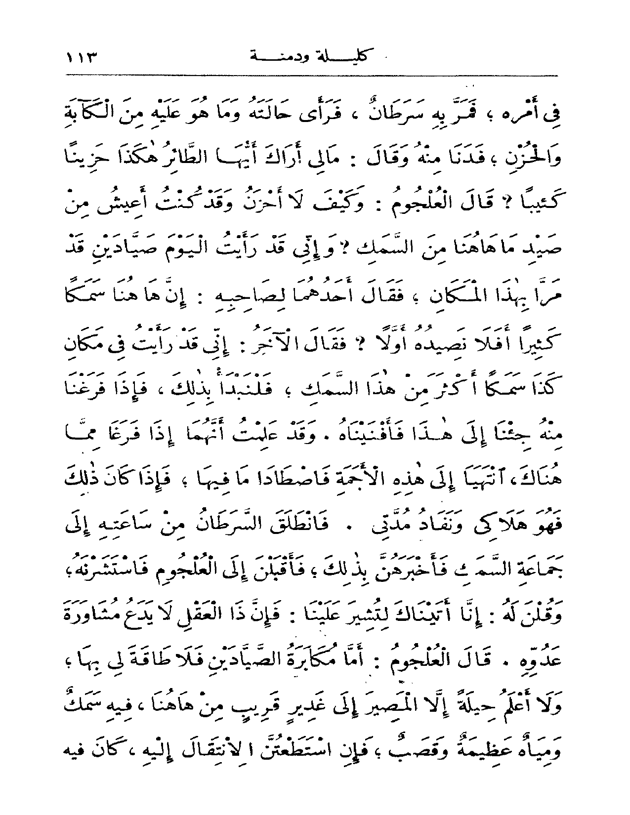 في أمره؛ فمر به سرطانٌ، فرأى حالته وما هو عليه من الكآبة والحزن؛ فدنا منه وقال: مالي أراك أيها الطائر هكذا حزيناً كئيباً؟ قال العلجوم: وكيف لا أحزن وقد كنت أعيش من صيد ما ها هنا من السمك؟ وإني قد رأيت اليوم صيادين قد مرا بهذا المكان؛ فقال أحدهما لصاحبه: إن ها هنا سمكاً كثيراً أفلا نصيده أولاً؟ فقال الآخر: إني قد رأيت في مكان كذا سمكاً أكثر من هذا السمك، فلنبدأ بذلك، فإذا فرغنا منه جئنا إلى هذا فأفنيناه. وقد علمت أنهما إذا فرغا مما هناك، انتهيا إلى هذه الأجمة فاصطادا ما فيها؛ فإذا كان ذلك فهو هلاكي ونفاذ مدتي. فانطلق السرطان من ساعته إلى جماعة السمك فأخبرهن بذلك؛ فأقبلن إلى العلجوم فاستشرنه؛ وقلن له: إنا أتينا لك لتشير علينا: فإن ذا العقل لا يدع مشاورة عدوه. قال العلجوم: أما مكابرة الصيادين فلا طاقة لي بها؛ ولا أعلم حيلةً إلا المصير إلى غديرٍ قريبٍ من ها هنا، فيه سمكٌ ومياهٌ عظيمةٌ وقصبٌ، فإن استطعن الانتقال إليه، كان فيه