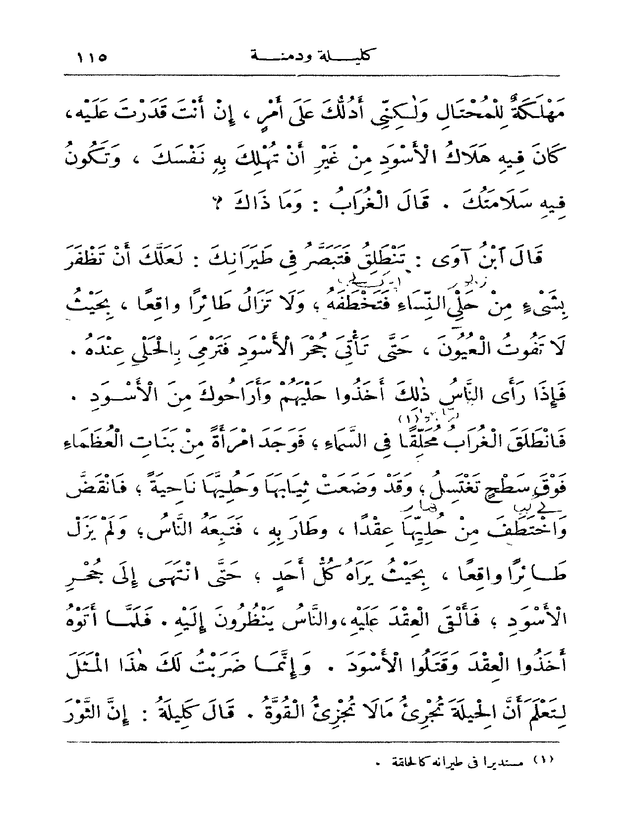 مهلكة للمحتال ولكني أدلك على أمرٍ، إن أنت قدرت عليه، كان فيه هلاك الأسود من غير أن تهلك به نفسك، وتكون فيه سلامتك. قال الغراب وما ذاك؟ قال ابن آوى: تنطلق فتبصر في طيرانك: لعلك أن تظفر بشيءٍ من حلي النساء فتخطفه؛ ولا تزال طائراً واقعاً، بحيث لا تفوت العيون، حتى تأتي حجر الأسود فترمي بالحلي عنده. فإذا رأى الناس ذلك أخذوا حليهم وأراحوك من الأسود. فانطلق الغراب محلقا في السماء؛ فوجد امرأةً من بنات العظماء فوق سطح تغتسل؛ وقد وضعت ثيابها وحليها ناحيةً؛ فانقض واختطف من حليها عقداً، وطار به، فتبعه الناس؛ ولم يزل طائراً واقعاً، بحيث يراه كل أحدٍ؛ حتى انتهى الأمر إلى جحر الأسود؛ فألقى العقد عليه، والناس ينظرون إليه. فلما أتوه أخذوا العقد وقتلوا الأسود. وإنما ضربت لك هذا المثل لتعلم أن الحيلة تجرئ مالا تجزئ القوة. قال كليلة: إن الثور