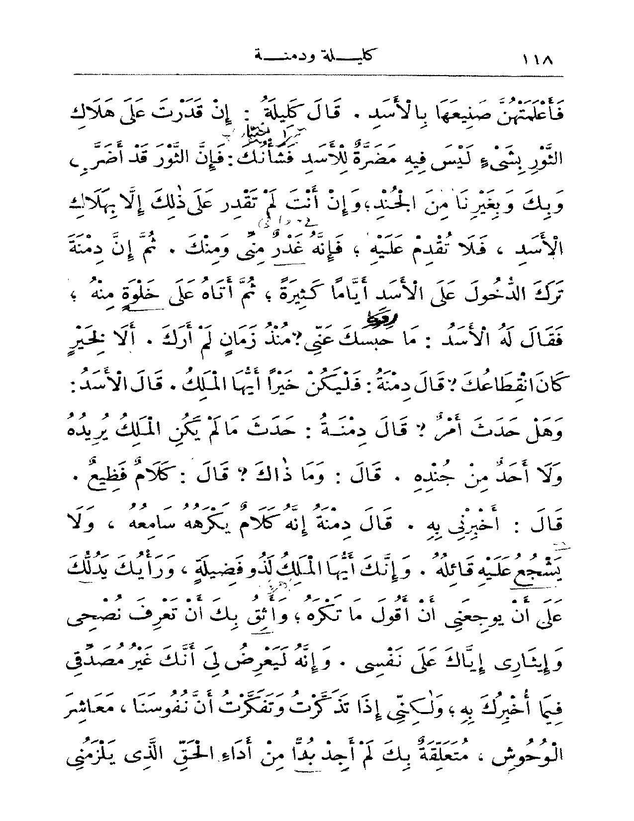 فأعلمتهن صنيعها بالأسد. قال كليلة: إن قدرت على هلاك الثور بشيءٍ ليس فيه مضرةٌ للأسد فشأنك: فإن الثور قد أضر بي وبك وبغيرنا من الجند؛ وإن أنت لم تقدر على ذلك إلا بهلاك الأسد، فلا تقدم عليه؛ فإنه غدرٌ مني ومنك. ثم إن دمنة ترك الدخول على الأسد أياماً كثيرةً؛ ثم أتاه على خلوةٍ منه؛ فقال له الأسد: ما حبسك عني؟ منذ زمان لم أرك. ألا لخيرٍ كان انقطاعك؟ قال دمنة: فليكن خيراً أيها الملك. قال الأسد: وهل حدث أمرٌ؟ قال دمنة: حدث ما لم يكن الملك يريده ولا أحد من جنده. قال: وما ذاك؟ قال: كلامٌ فظيعٌ. قال: أخبرني به. قال دمنة إنه كلامٌ يكرهه سامعه، ولا يشجع عليه قائله. وإنك أيها الملك لذو فضيلةٍ، ورأيك يدلك على أن يوجعني أن أقول ما تكره؛ وأثق بك أن تعرف نصحي وإيثاري إياك على نفسي. وإنه ليعرض لي أنك غير مصدقي فيما أخبرك به؛ ولكني إذا تذكرت وتفكرت أن نفوسنا، معاشر الوحوش، متعلقةٌ بك لم أجد بداً من أداء الحق الذي يلزمني