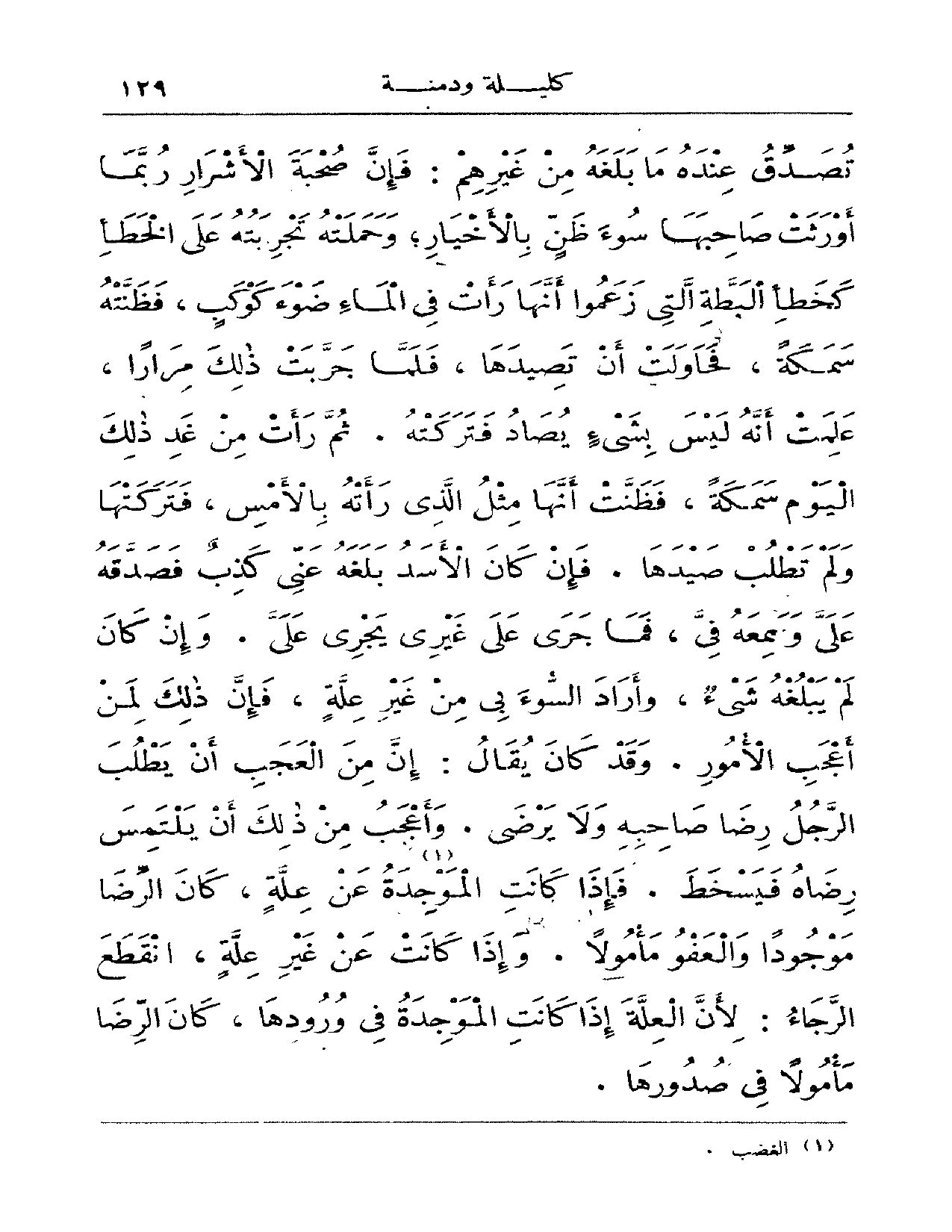 تصدق عنده ما بلغه من غيرهم: فإن صحبة الأشرار ربما أورثت صاحبها سوء الظن بالأخيار؛ وحملته تجربته على الخطأ كخطأ البطة التي زعموا أنها رأت في الماء ضوء كوكبٍ، فظنته سمكةً، فحاولت أن تصيدها، فلما جربت ذلك مراراً، علمت أنه ليس بشيءٍ يصاد فتركته. ثم رأت من غد ذلك اليوم سمكةً، فظنت أنها مثل الذي رأته بالأمس، فتركتها ولم تطلب صيدها. فإن كان الأسد بلغه عني كذبٌ فصدقه علي وسمعه في، فما جرى على غيري يجري علي. وإن كان لم يبلغه شيءٌ، وأراد السوء بي من غير علةٍ، فإن ذلك لمن أعجب الأمور. وقد كان يقال: إن من العجب أن يطلب الرجل رضا صاحبه ولا يرضى. وأعجب من ذلك أن يلتمس رضاه فيسخط. فإذا كانت الموجدة عن علةٍ، كان الرضا موجوداً والعفو مأمولاً. وإذا كانت عن غير علةٍ، انقطع الرجاء: لأن العلة إذا كانت المودة في ورودها، كان الرضا مأمولاً في صدورها.