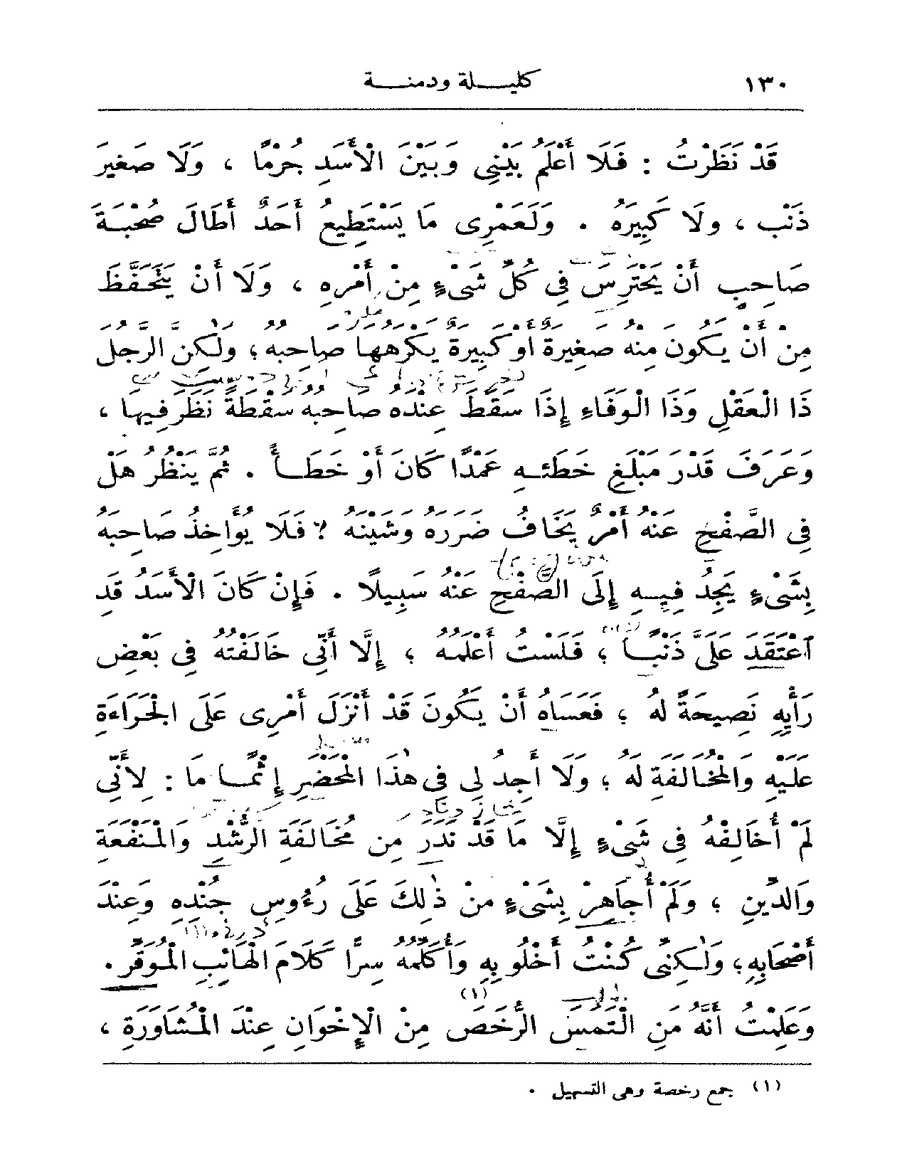 قد نظرت: فلا أعلم بيني وبين الأسد جرماً، ولا صغير ذنب، ولا كبيره. ولعمري ما يستطيع أحد أطال صحبة صاحب أن يحترس في كل شيءٍ من أمره، ولا أن يتحفظ من أن يكون منه صغيرةٌ أو كبيرةٌ يكرهها صاحبه؛ ولكن الرجل ذا العقل وذا الوفاء إذا سقط عنده صاحبه سقطةً نظر فيها، وعرف قدر مبلغ خطئه عمداً كان أو خطأً. ثم ينظر هل في الصفح عنه أمرٌ يخاف ضره وشينه؟ فلا يؤاخذ صاحبه بشيءٍ يد فيه إلى الصفح عنه سبيلاً. فإن كان الأسد قد اعتقد على ذنباً؛ فلست أعلمه؛ إلا أني خالفته في بعض رأيه نصيحةً له؛ فعساه أن يكون قد أنزل أمري على الجراءة عليه والمخالفة له؛ ولا أجد لي في هذا المحضر إثماً ما: لأني لم أخالفه في شيءٍ إلا ما قد ندر من خالفة الرّشد والمنفعة والدِّين، ولم أجاهر بشيءٍ من ذلك على رءوس جنده وعند أصحابه؛ ولكني كنت أخلو به وأكلمه سراً كلام الهائب الموقر وعلمت أنه من التمس الرخص من الإخوان عند المشاورة،