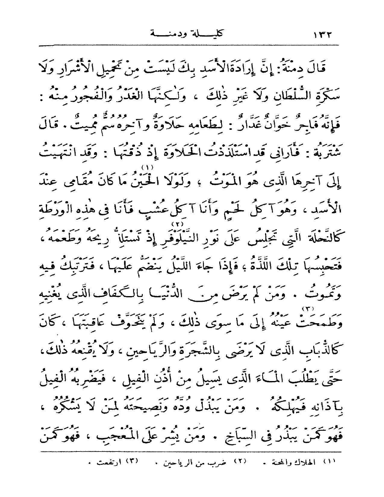 قال دمنة: إن إرادة الأسد بك ليست من تحميل الأشرار ولا سكرة السلطان ولا غير ذلك، ولكنها الغدر والفجور منه: فإن فاجرٌ خوانٌ غدارٌ: لطعامه حلاوةٌ وآخره سمٌ مميتٌ. قال شتربة: فأراني قد استلذذت الحلاوة إذ ذقتها: وقد انتهيت إلى آخرها الذي هو الموت؛ ولولا الحين ما كان مقامي عند الأسد، وهو آكل لحمٍ وأنا آكل عشبٍ فأنا في هذه الورطة كالنحلة التي تجلس على نور النيلوفر إذ تستلذ ريحه وطعمه، فتحبسها تلك اللذة؛ فإذا جاء الليل ينضم عليها، فترتبك فيه وتموت. ومن لم يرض من الدنيا بالكفاف الذي يغنيه وطمحت عينه إلى ما سوى ذلك، ولم يتخوف من عاقبتها، كان كالذباب الذي لا يرضى بالشجرة والرياحين، ولا يقنعه ذلك، حتى يطلب الماء الذي يسيل من أذن الفيل، فيضربه الفيل بآذانه فيهلكه. ومن يبذل وده ونصيحته لمن لا يشكره، فهو كمن يبذر في السباخ. ومن يشر على المعجب، فهو كمن
