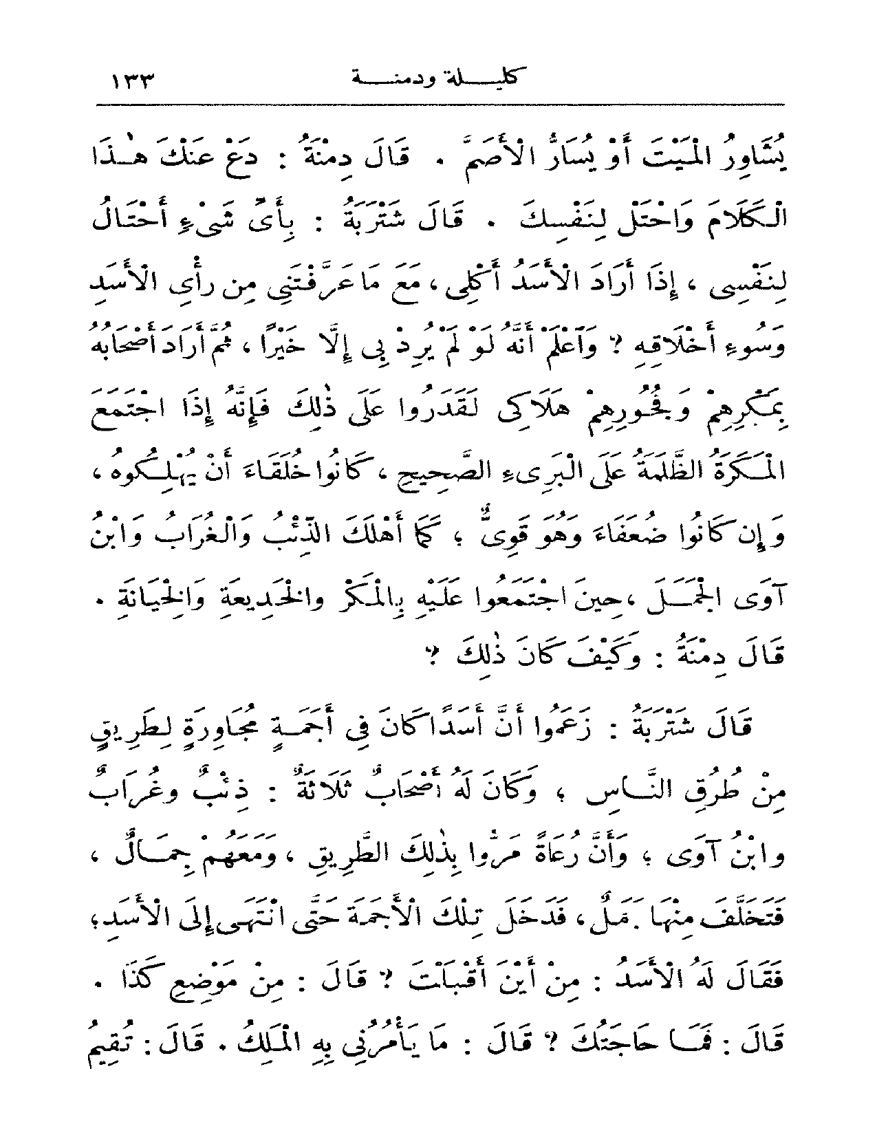 يشاور الميت أو يسار الأصم. قال دمنة: دع عنك هذا الكلام واحتل لنفسك. قال شتربة: بأي شيءٍ أحتال لنفسي، إذا أراد الأسد أكلي، مع ما عرفتني به من رأي الأسد وسوء أخلاقه؟ وأعلم أنه لم يرد بي إلا خيراً، ثم أراد أصحابه بمكرهم وفجورهم هلاكي لقدروا على ذلك فإنه إذا اجتمع المكرة الظلمة على البريء الصحيح، كانوا خلقاء أن يهلكوه، وإن كانوا ضعفاء وهو قوي؛ كما أهلك الذئب والغراب وابن آوى الجمل، حين اجتمعوا عليه بالمكر والخديعة والخيانة. قال دمنة: وكيف كان ذلك؟