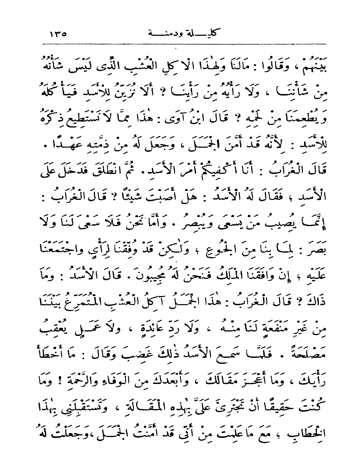 بينهم، وقالوا: مالنا ولهذا الأكل العشب الذي ليس شأنه من شأننا، ولا رأيه من رأينا؟ ألا نزين للأسد فيأكله ويطعمنا من لحمه؟ قال ابن آوى: هذا مما لا نستطيع ذكره للأسد: لأنه قد أمن الجمل، وجعل له من ذمته عهداً. قال الغراب: أنا أكفيكم أمر الأسد. ثم انطلق فدخل على الأسد؛ فقال له الأسد: هل أصبت شيئاً؟ قال الغراب: إنما يصيب من يسعى ويبصر. وأما نحن فلا سعي لنا ولا بصر: لما بنا من الجوع؛ ولكن قد وفقنا لرأي واجتمعنا عليه؛ إن وافقنا الملك فنحن له مجيبون. قال الأسد: وما ذاك؟ قال الغراب: هذا الجمل آكل العشب المتمرّغ بيننا من غير منفعة لنا منه، ولا رد عائدةٍ، ولا عمل يعقب مصلحةً. فلما سمع الأسد ذلك غضب وقال: ما أخطأ رأيك، وما اعجز مقالك، وأبعدك من الوفاء والرحمة؟ وما كنت حقيقاً أن تجتري علي بهذه المقالة، وتستقبلني بهذا الخطاب؛ مع ما علمت من أني قد أمنت الجمل، وجعلت له