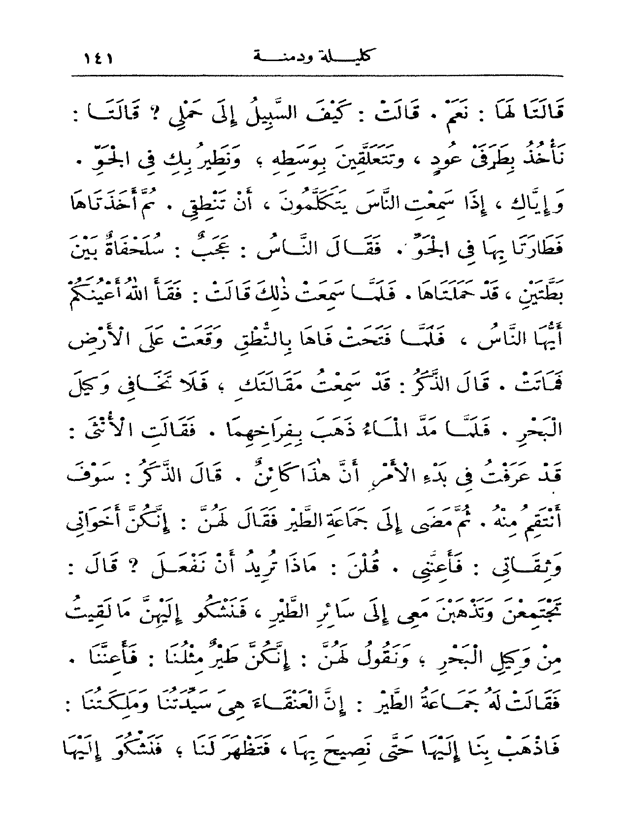 قالتا لها: نعم. قالت: كيف السبيل إلى حملي؟ قالتا: نأخذ بطرفي عودٍ، وتتعلقين بوسطه؛ ونطير بك في الجو. وإياك، إذا سمعت الناس يتكلمون، أن تنطقي. ثم أخذتاها فطارتا بها في الجو. فقال الناس: عجبٌ: سلحفاة بين بطتين، قد حملتاها. فلما سمعت ذلك قالت: فقأ الله أعينكم أيها الناس، فلما فتحت فاها بالنطق وقعت على الأرض فماتت. قال الذكر: قد سمعت مقالتك؛ فلا تخافي وكيل البحر. فلما مد الماء ذهب بفراخها. فقالت الأنثى: قد عرفت في بدء الأمر أن هذا كائنٌ. قال الذكر: سوف أنتقم منه. ثم مضى إلى جماعة الطير فقال لهن: إنكن أخواتي وثقاتي: فأعنني. قلن: ما تريد أن نفعل؟ قال: تجتمعن وتذهبن معي إلى سائر الطير، فنشكو إليهن ما لقيت من وكيل البحر؛ ونقول لهن: إنكن طيرٌ مثلنا: فأعننا. فقالت له جماعة الطير: إن العنقاء هي سيدتنا وملكتنا: فاذهب بنا إليها حتى نصيح بها، فنظهر لنا؛ فنشكو إليها