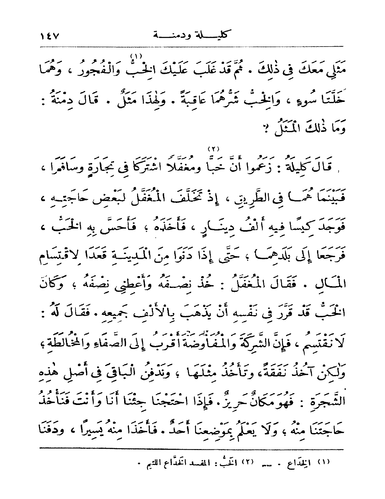 قال كليلة: زعموا أن خباً ومغفلاً اشتركا في تجارةٍ وسافرا، فبينما هما في الطريق، إذ تخلف المغفل لبعض حاجته، فوجد كيساً فيه ألف دينار، فأخذه؛ فأحس به الخب، فرجعا إلى بلدهما؛ حتى إذا دنوا من المدينة قعدا لاقتسام المال. فقال المغفل: خذ نصفه وأعطني نصفه؛ وكان الخب قد قرر في نفسه أن يذهب بالألف جميعه. فقال له: لا نقتسم، فإن الشركة والمفاوضة أقرب إلى الصفاء والمخالطة؛ ولكن آخذ نفقةً، وتأخذ مثلها؛ وندفن الباقي في أصل هذه الشجرة: فهو مكانٌ حريزٌ. فإذا احتجنا جئنا أنا وأنت فنأخذ حاجتنا منه؛ ولا يعلم بموضعنا أحدٌ. فأخذا منه يسيراً، ودفنا