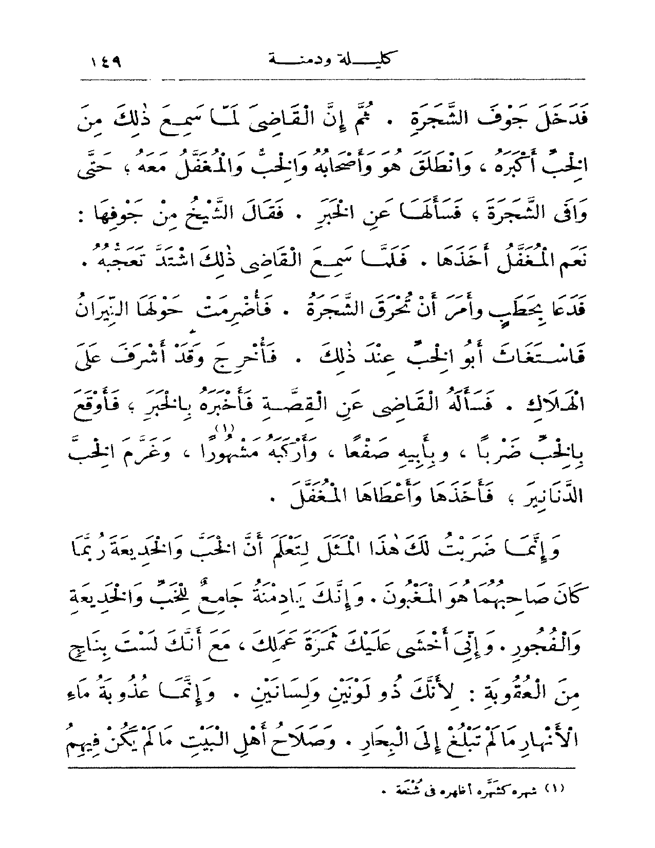 فدخل جوف الشجرة. م إن القاضي لما سمع ذلك من الخب أكبره، وانطلق هو وأصحابه والخصب والمغفل معه؛ حتى وافى الشجرة؛ فسألها عن الخبر. فقال الشيخ من جوفها: نعم المغفل أخذها. فلما سمع القاضي ذلك اشتد تعجبه. فدعا بحطب وأمر أن تحرق الشجرة. فأضرمت حولها النيران فاستغاث أبو الخب عند ذلك. فأخرج وقد أشرف على الهلاك. فسأله القاضي عن القصة فأخبره بالخبر؛ فأوقع بالخب ضرباً، وبأبيه صفعاً، وأركبه مشهوراً، وغرّم الخب الدنانير فأخذها وأعطاها المغفل.