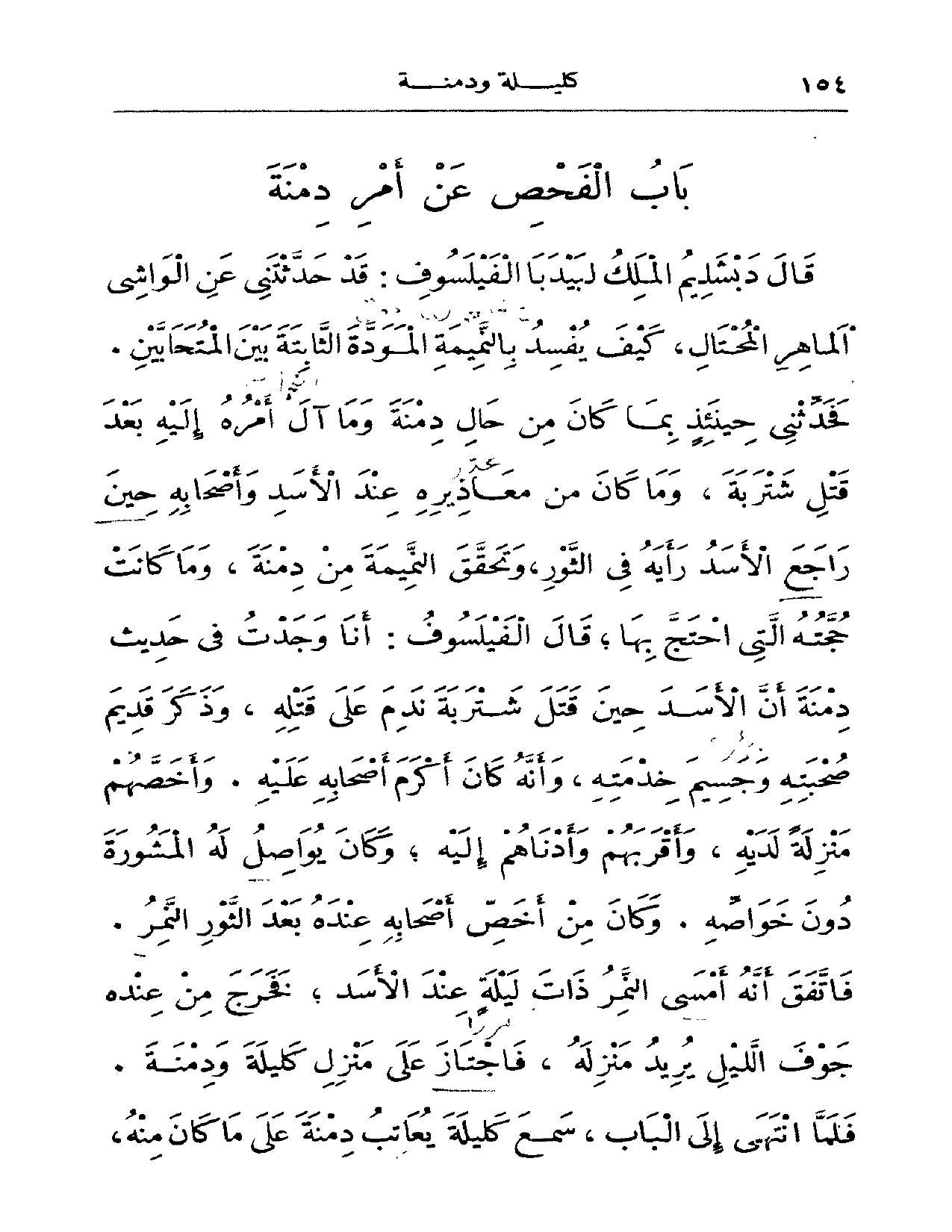 قال دبشليم الملك لبيدبا الفيلسوف: قد حدثتني عن الواشي الماهر المحتال، كيف يفسد بالنميمة المودة الثابتة بين المتحابين. فحدثني حينئذٍ بما كان من حالة دمنة وما آل أمره إليه بعد قتل شتربة، وما كان من معاذيره عند الأسد وأصحابه حين راجع الأسد رأيه في الثور، وتحقق النميمة من دمنة، وما كانت حجته التي احتج بها؛ قال الفيلسوف: أنا وجدت في حديث دمنة أن الأسد حين قتل شتربة ندم على قتله، وذكر قديم صحبته وجسيم خدمته، وأنه كان أكرم أصحابه عليه. وأخصهم منزلةً لديه، وأقربهم وأدناهم إليه؛ وكان يواصل له المشورة دون خواصه. وكان من أخص أصحابه عنده بعد الثور النمر. فاتفق أنه أمسى لنمر ذات ليلةٍ عند الأسد؛ فخرج من عنده جوف الليل يردي منزله، فاجتاز على منزل كليلة ودمنة. فلما انتهى إلى الباب سمع كليلة يعاتب دمنة على ما كان منه،