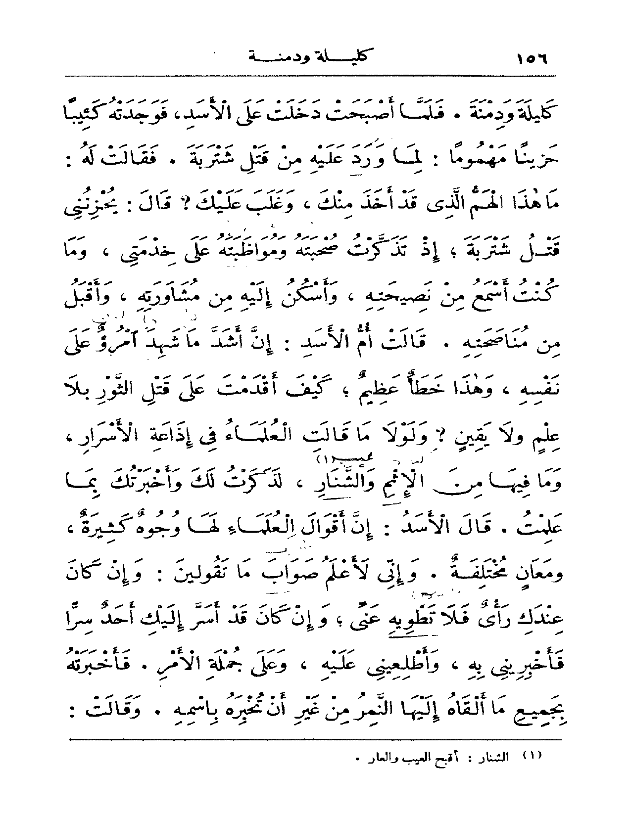 كليلة ودمنة. فلما أصبحت دخلت على الأسد، فوجدته كئيباً حزيناً مهموماً: لما ورد عليه من قتل شتربة. فقالت له: ما هذا الهم الذي قد أخذ منك، وغلب عليك؟ قال: يحزنني قتل شتربة؛ إذ تذكرت صحبته ومواظبته على خدمتي، وما كنت أسمع من مناصحته. قالت أم الأسد: إن أشد ما شهد امرؤٌ بلا علم ولا يقين؟ ولولا ما قالت العلماء في إذاعة الأسرار وما فيها من الإثم والشنار، لذكرت لك ولأخبرتك بما علمت. قال الأسد: إن أقوال العلماء لها وجوهٌ كثيرةٌ، ومعانٍ مختلفةٌ. وإني لأعلم صواب ما تقولين: وإن كان عندك رأي فلا تطويه عني؛ وإن كان قد أسر إليك أحدٌ سراً فأخبريني به، وأطلعيني عليه، وعلى جملة الأمر. فأخبرته بجميع ما ألقاه إليها النمر من غير أن تخبره باسمه. وقال: