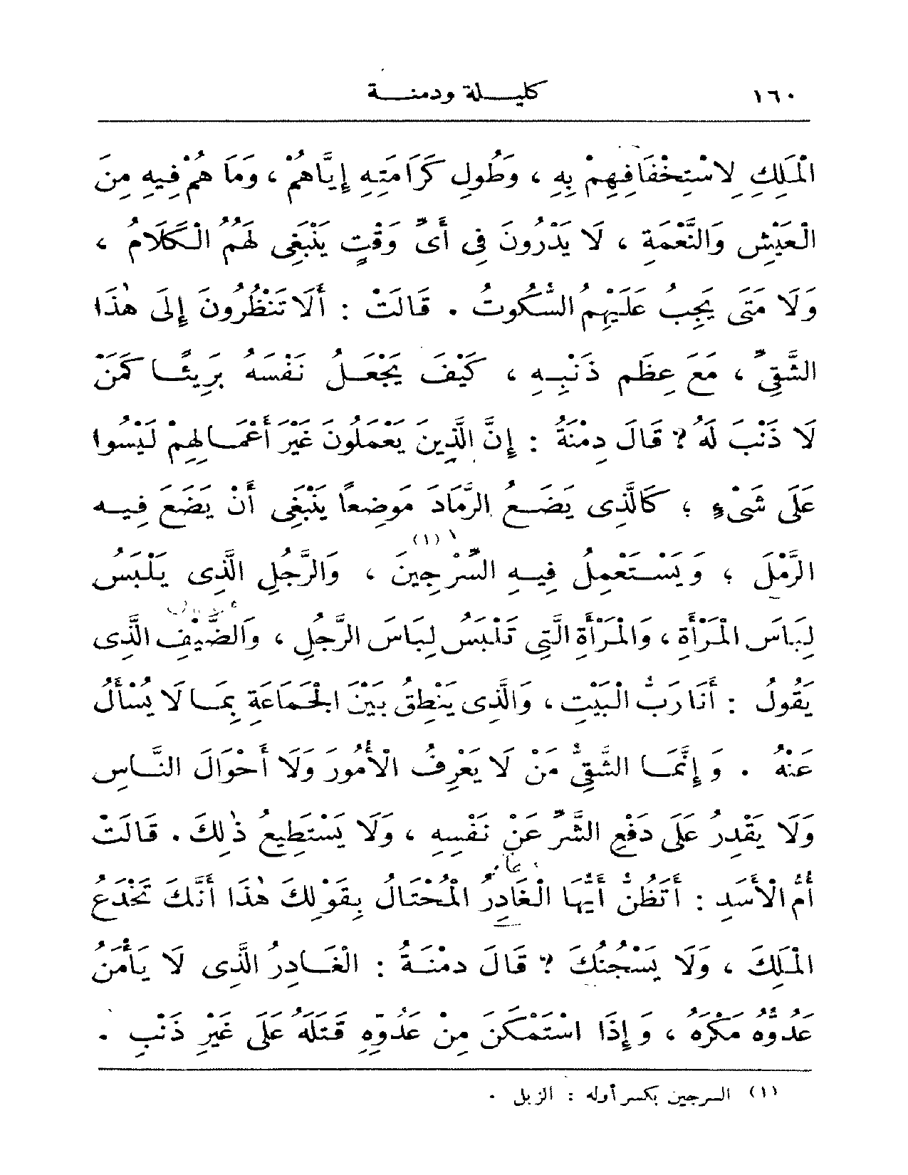 الملك لاستخفافهم به، وطول كرامته إياهم، وما هم فيه من العيش والنعمة، لا يدرون في أي وقت ينبغي لهم الكلام، ولا متى يجب عليهم السكوت. قالت: ألا تنظرون إلى هذا الشقي، مع عظم ذنبه، كيف يجعل نفسه بريئاً كمن لا ذنب له؟ قال دمنة: إن الذين يعملون غير أعمالهم ليسوا على شيء؛ كالذي يضع الرماد موضعاً ينبغي أن يضع فيه الرمل؛ ويستعمل فيه السرجين، والرجل الذي يلبس لباس المرأة، والمرأة التي تلبس لباس الرجل، والضيف الذي يقول: أنا رب البيت، والذي ينطق بين الجماعة بما لا يسأل عنه. وإنما الشقي من لا يعرف الأمور ولا أحوال الناس لا يقدر على دفع الشر عن نفسه، ولا يستطيع ذلك. قالت أم الأسد: أتظن أيها الغادر المحتال بقولك هذا أنك تخدع الملك، ولا يسجنك؟ قال دمنة: الغادر الذي لا يأمن عدوه مكره، وإذا استمكن من عدوه قتله على غير ذنب.