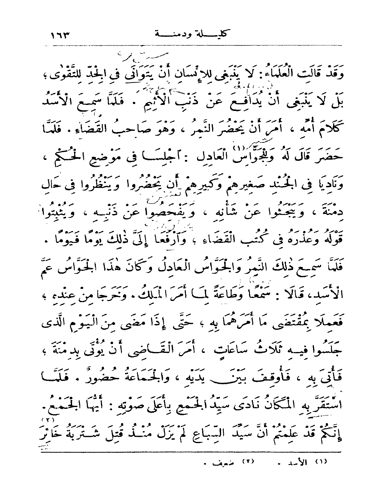 وقد قالت العلماء: لا ينبغي للإنسان أن يتوانى في الجد للتقوى؛ بل لا ينبغي أن يدافع عن ذنب الأثيم. فلما سمع الأسد كلام أمه، أمر أن يحضر النمر، وهو صاحب القضاء. فلما حضر قال له وللجوّاس العادل: اجلسا في موضع الحكم، وناديا في الجند صغيرهم وكبيرهم أن يحضروا وينظروا في حال دمنة، ويبحثوا في شأنه، ويفحصوا عن ذنبه، ويثبتوا قوله وعذره في كتب القضاء؛ وارفعا إلى ذلك يوماً فيوماً. فلما سمع ذلك النمر والجواس العادل وكان هذا الجواس عم الأسد، قالا: سمعاً وطاعةً لما أمر الملك. وخرجا من عنده؛ فعملا بمقتضى ما أمرهما به؛ حتى إذا مضى من اليوم الذي جلسوا فيه ثلاث ساعات، أمر القاضي أن يؤتى بدمنة؛ فأتي به، فأوقف بين يديه، والجماعة حضور. فلما استقربه المكان نادى سيد الجمع بأعلى صوته: أيها الجمع. إنكم قد علمتم أن سيد السباع لم يزل منذ قتل شتربة خائر