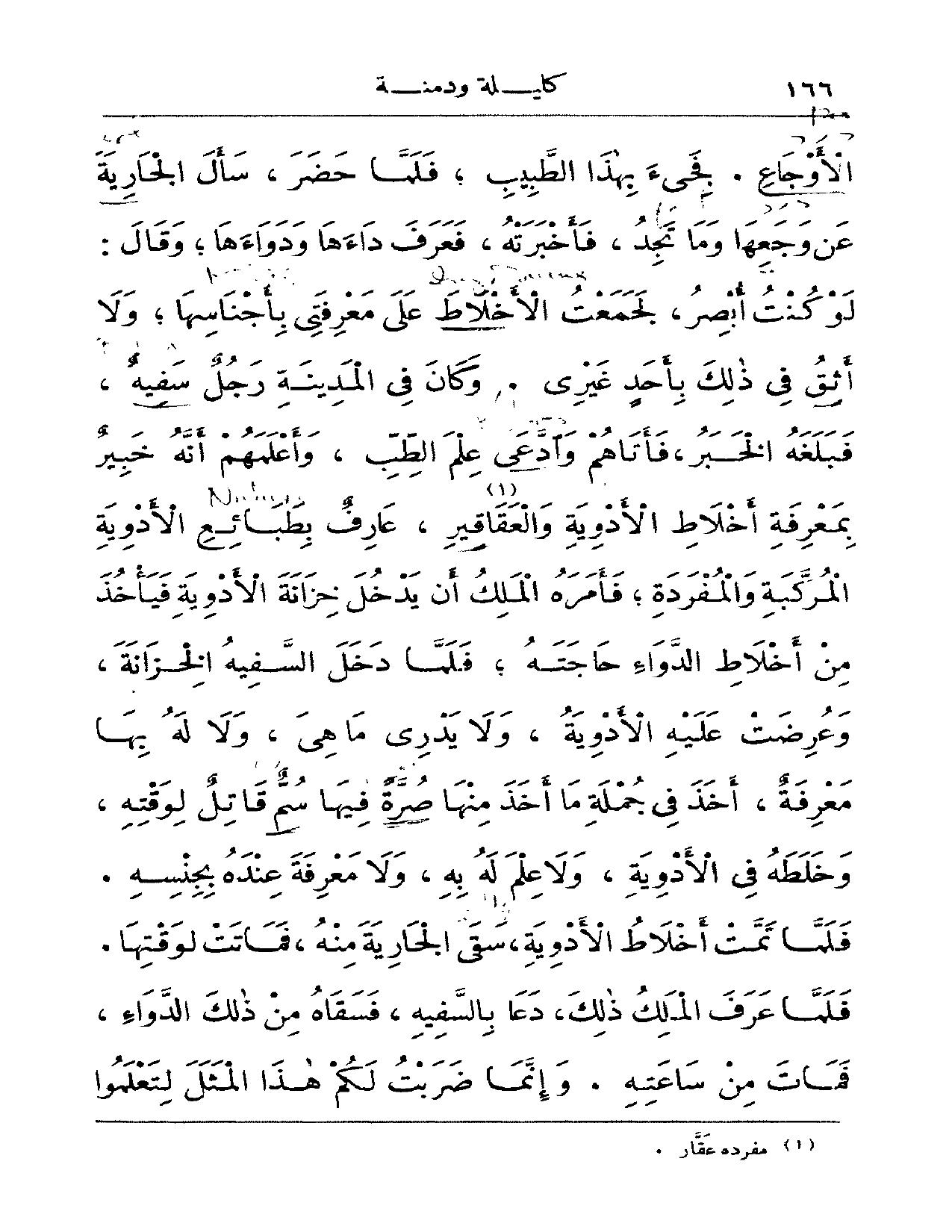 الأوجاع. فجيء بهذا الطبيب، فلما حضر، سأل الجارية عن وجعها وما تجد، فأخبرته، فعرف دائها ودواءها، وقال: لو كنت أبصر، لجمعت الأخلاط على معرفتي بأجناسها، ولا أثق في ذلك بأحد غيري. وكان في المدينة رجل سفيه، فبلغه الخبر، فأتاهم وادعى علم الطب، وأعلمهم انه خبير بمعرفة أخلاط الأدوية والعقاقير، عارف بطبائع الأدوية المركبة والمفردة، فأمره الملك أن يدخل خزانة الأدوية فيأخذ من أخلاط الدواء حاجته، فلما دخل السفيه الخزانة، وعرضت عليه الأدوية، ولا يدري ما هي، ولا له بها معرفة، أخذ في جملة ما أخذ منها صرة فيها سمّ قاتل لوقته، وخلطه في الأدوية، ولا علم له به، ولا معرفة عنده بجنسه. فما تمت أخلاط الأدوية، سقى الجارية منه، فماتت لوقتها. فلما عرف الملك ذلك، دعا بالسفيه، فسقاه من ذلك الدواء، فمات من ساعته. وإنما ضربت لكم هذا المثل لتعلموا