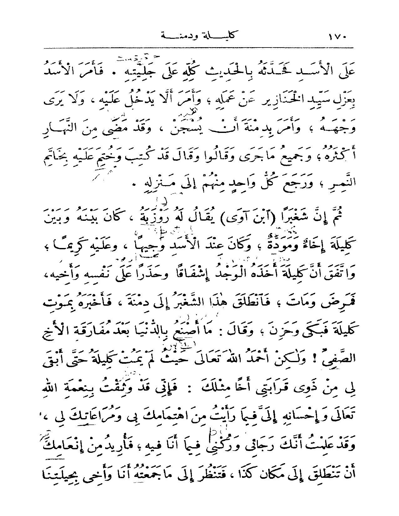 ثم إن شغبراً يقال له روزبة، كان بينه وبين كليلة إخاء ومودة، وكان عند الأسد وجيهاً، وعليه كريماً، واتفق أن كليلة أخذه الوجد إشفاقاً وحذراً على نفسه وأخيه، فمرض ومات، فانطلق هذا الشغبر إلى دمنة، فأخبره بموت كليلة فبكى وحزن، وقال: ما أصنع بالدنيا بعد مفارقة الأخ الصفى؟؟؟؟؟! ولكن أحمد الله تعالى حيث لم يمت كليلة حتى أبقى لي من ذوي قرابتي أخاً مثلك: فإني قد وثقت بنعمة الله تعالى وإحسانه إليّ فيما رأيت من اهتمامك بي ومراعاتك لي، وقد علمت أنك رجائي وركني فيما أنا فيه، فأريد من إنعامك أن تنطلق إلى مكان كذا، فتنظر إلى ما جمعته أنا وأخي بحيلتنا