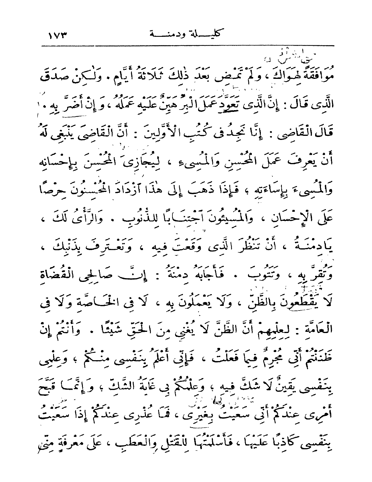 موافقة لهواك ولم تمض بعد ذلك ثلاثة أيام. ولكن صدق الذي قال: إن الذي تعود عمل البر هين عليه عمله وإن أضربه. قال القاضي: إن نجد في كتب الأولين: أن القاضي ينبغي له أن يعرف عمل المحسن والمسيء ليجازى المحسن بإحسانه والمسيء بإساءته فإذا ذهب إلى هذا ازداد المحسنون حرصاً على الإحسان والمسيؤون إجتناباً للذنوب. والرأي لك يا دمنة أن تنظر الذي وقعت فيه وتعترف بذنبك وتقر به وتتوب. فأجابه دمنة: إن صالحي القضاة لا يقطعون بالظن ولا يعملون به لا في الخاصة ولا في العامة: لعلمهم أن الظن لا يغني من الحق شيئا. وأنتم إن ظننتم أني مجرم فيما فعلت فإني أعلم بنفسي منكم وعلمي بنفسي يقين لاشك فيه وعلمكم بي غاية الشك وإنما قبح أمري عندكم أني سعيت بغيري فما عذري عندكم إذا سعيت بنفسي كاذبا عليها فأسلمتها للقتل والعطب على معرفة مني
