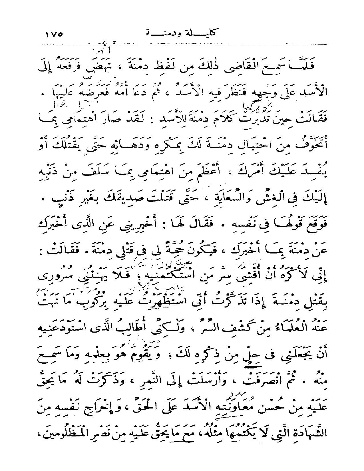 فلما سمع القاضي ذلك من لفظ دمنة نهض فرفعه إلى الأسد على وجهه فنظر في الأسد ثم دعا أمه فعرضه عليها. فقالت حين تدبرت كلام دمنة للأسد: لقد صار اهتمامي بما أتخوف من احتيال دمنة لك بمكره ودهائه حتى يقتلك أو يفسد عليك أمرك أعظم من اهتمامي بما سلف من ذنبه إليك في الغش والسعاية حتى قتلت صديقك. بغير ذنب. فوقع قولها في نفسه. فقال لها: أخبريني عن الذي أخبرك عن دمنة بما أخبرك فيكون حجة لي في قتل دمنة. فقالت: إني لأكره أن أفشي سر استكتمنيه، فلا يهنئني سروري بقتل دمنة إذا تذكرت أني استظهرت عليه بركوب ما نهت عنه العلماء من كشف السر ولكني أطالب الذي استودعنيه أن يجعلني في حل من ذكره لك ويقوم هو بعلمه وما سمع منه. ثم انصرفت وأرسلت إلى النمر وذكرت له ما يحق عليه من حسن معاونته الأسد على الحق وإخراج نفسه من الشهادة التي لا يكتمها مثله مع ما يحق عليه من نصر المظلومين