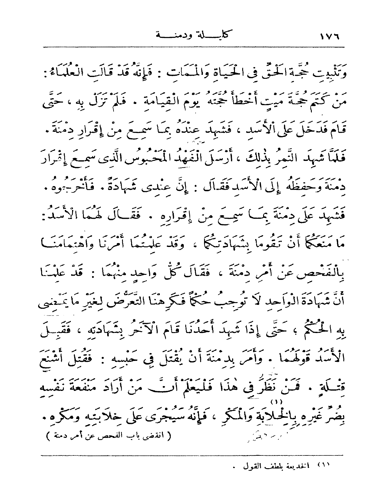وتثبيت حجة الحق في الحياة والممات: فإنه قد قالت العلماء: من كتم حجة ميت أخطأ حجته يوم القيامة. فلم تزل به حتى قام فدخل على الأسد فشهد عنده بما سمع من إقرار دمنة. فلما شهد النمر بذلك أرسل الفهد المحبوس الذي سمع إقرار دمنة وحفظه إلى الأسد فقال: إن عندي شهادة. فأخرجوه. فشهد على دمنة بما سمع من إقراره. فقال لهما الأسد: ما منعكما أن تقوما بشهادتكما وقد علمتما أمرنا واهتمامنا بالفحص عن أمر دمنة فقال كل واحد منهما: قد علمنا أن شهادة الواحد لا توجب حكماً فكرهنا التعرض لغير ما يمضي به الحكم حتى إذا شهد أحدنا قام الآخر بشهادته فقبل الأشد قولهما. وأمر بدمنة أن يقتل في حبسه: فقتل أشنع قتلة. فمن نظر في هذا فليعلم أن من أراد منفعة نفسه بضر غيره بالخلابة والمكر فإنه سيجري على خلابته ومكره.