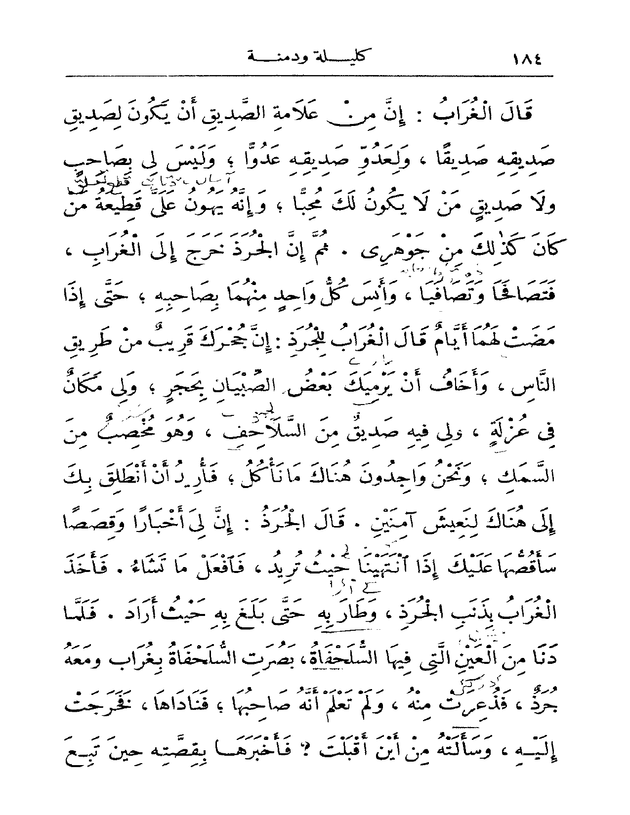 قال الغراب: إن من علامة الصديق أن يكون لصديق صديقه صديقاً، ولعدو صديقه عدواً؛ وليس لي بصاحب ولا صديق من لا يكون لك محباً؛ وإنه يهون عن قطيعة من كان كذلك من جوهري. ثم إن الجرذ خرج إلى الغراب فتصافحا وتصافيا، وأنس كل واحد منهما بصاحبه؛ حتى إذا مضت لهما أيام قال الغراب للجرذ: إن جحرك قريب من طريق الناس، وأخاف أن يرميك بعض الصبيان بحجرٍ؛ ولي مكان في عزلة، ولي فيه صديقٌ من السلاحف وهو مخصب من السمك ونحن واجدون هناك ما نأكل فأريد أن أنطلق بك إلى هناك لنعيش آمنين. قال الجرذ: إن لي أخبار وقصصاً سأقصها عليك إذا انتهينا حيث تريد فافعل ما تشاء. فأخذ الغراب بذنب الجرذ وطار به حتى بلغ به حيث أراد. فلما دنى من العين التي فيها السلحفاة بصرت السلحفاة بغراب ومعه جرذ فذعرت منه ولم تعلم أنه صاحبها، فناداه فخرجت إليه وسألته من أين أقبلت؟ فأخبرها بقصته حين تبع