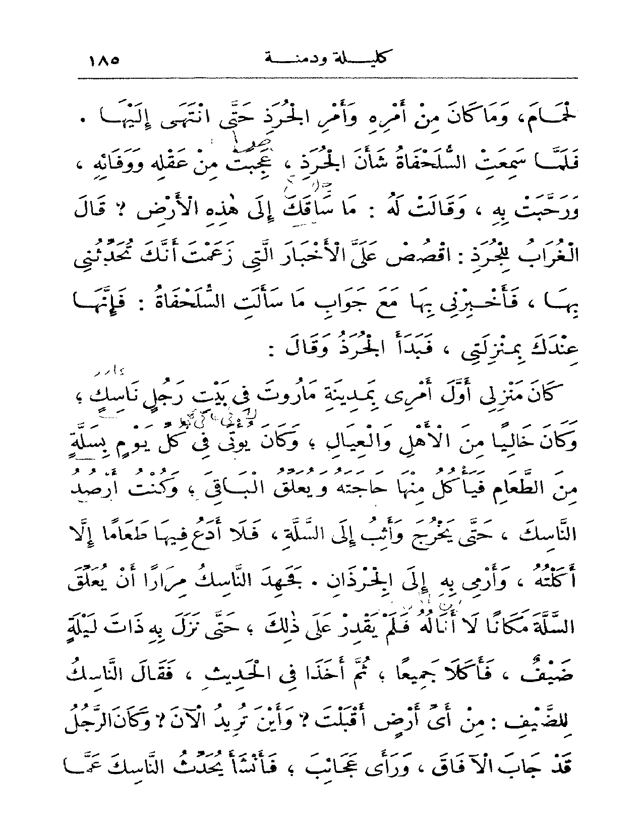الحمام وما كان من أمره وأمر الجرذ حتى انتهى إليها. فلما سمعت السلحفاة شأن الجرذ عجبت من عقله ووفاءه ورحبت به وقالت له: ما ساقك إلى هذه الأرض؟ قال الغراب للجرذ: اقصص عليّ الأخبار التي زعمت أنك تحدثني بها فأخبرني بها مع جواب ما سألت السلحفاة: فإنها عندك بمنزلتي، فبدأ الجرذ وقال: كان منزلي أول أمري بمدينة ماروت في بيت رجل ناسك وكان خالياً من الأهل والعيال، وكان يؤتى في كل يوم بسلة من الطعام فيأكل منها حاجته ويعلق الباقي، وكنت أرصد الناسك، حتى يخرج وأثب إلى السلة، فلا أدع فيها طعاماً إلا أكلته، وأرمي به إلى الجرذان. فجهد الناسك مراراً أن يعلق السلة مكاناً لا أناله فلم يقدر على ذلك، حتى نزل به ذات ليلة ضيف فأكلا جميعاً، ثم أخذا في الحديث فقال الناسك للضيف: من أي أرض أقبلت؟ وأين تريد الآن؟ وكان الرجل قد جاب الآفاق ورأى عجائب فأنشأ يحدث الناسك عمّا