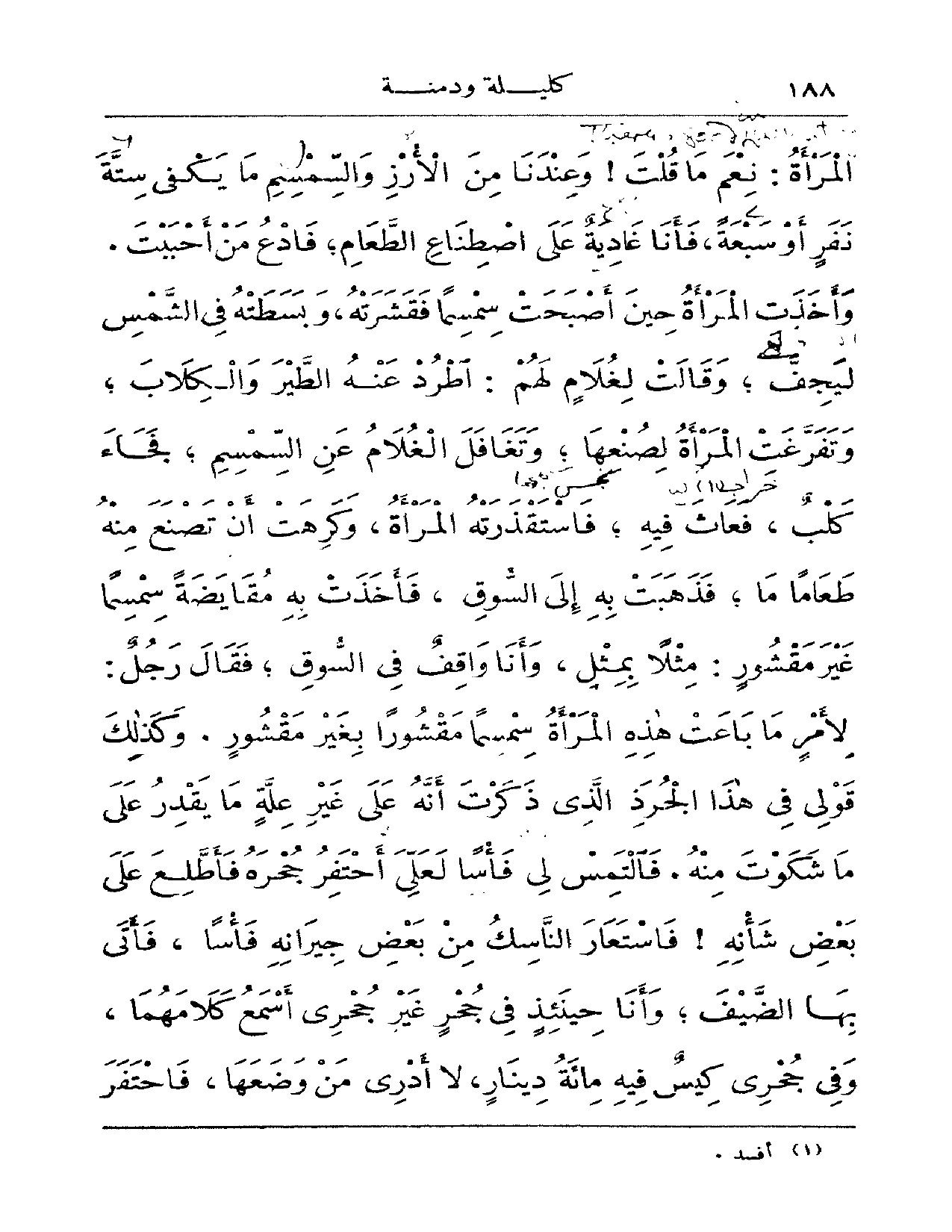 المرأة: نعم ما قلت! وعندنا من الأرز والسمسم ما يكفي ستة نفر أو سبعة، فأنا غاديةٌ على اصطناع الطعام، فادع من أحببت. وأخذت المرأة حين أصبحت سمسماً فقشرته، وبسطته في الشمس ليجفِّ، وقالت لغلام لهم: اطرد عنه الطير والكلاب وتفرغت المرأة لصنعها؛ وتغافل الغلام عن السمسم؛ فجاء كلبٌ، فعاث فيه؛ فاستقذرته المرأة، وكرهت أن تصنع منه طعاماً ما؛ فذهبت به إلى السوق، فأخذت به مقايضة سمسماً غير مقشور: مثلاً بمثلٍ، وأنا واقفٌ في السوق؛ فقال رجلٌ: لأمرٍ ما باعت هذه المرأة سمسماً مقشوراً بغير مقشورٍ. وكذلك قولي في هذا الجرذ الذي ذكرت أنه على غير علةٍ ما يقدر على ما شكوت منه. فالتمس لي فأساً لعلي أحتقره جحره فأطلع على بعض شأنه. فاستعار الناسك من بعض جيرانه فأساً، فأتى بها الضيف، وأنا حينئذٍ في غير جحري أسمع كلامهما، وفي جحري كيس فيه مائة دينار، لا أدري من وضعها، فاحتفر