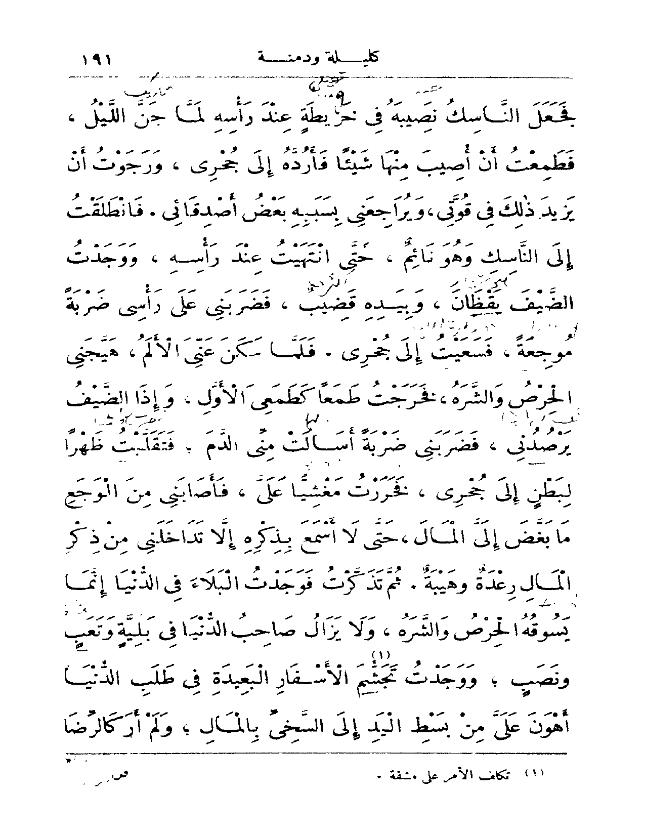 فجعل الناسك نصيبه في خريطة عند رأسه ولما جنّ الليل، فطمعت أن أصيب منها شيئاً فأرده إلى جحري، ورجوت أن يزيد ذلك في قوتي، ويراجعني بسببه بعض أصدقائي. فانطلقت إلى الناسك وهو نائم، حتى انتهيت عند رأسه، ووجدت الضيف يقظان، وبيده قضيب، فضربني على رأسي ضربة موجعة، فسعيت إلى جحري. فلما سكن عني الألم، هيجني الحرص والشره، فخرجت طمعاً كطمعي الأول، وإذا الضيف يرصدني، فضربني ضربة أسالت مني الدم، فتقلبت ظهراً لبطن إلى جحري، فخررت مغشياً عليّ، فأصابني من الوجع ما بغض إلى المال رعدة وهيبة. ثم تذكرت فوجدت البلاء في الدنيا إنما يسوقه الحرص والشره، ولا يزال صاحب الدنيا في بلية وتعب ونصب، ووجدت تجشم الأسفار البعيدة في طلب الدنيا أهون عليّ من بسط اليد إلى السَّخىِّ بالمال، ولم أر كالرضا