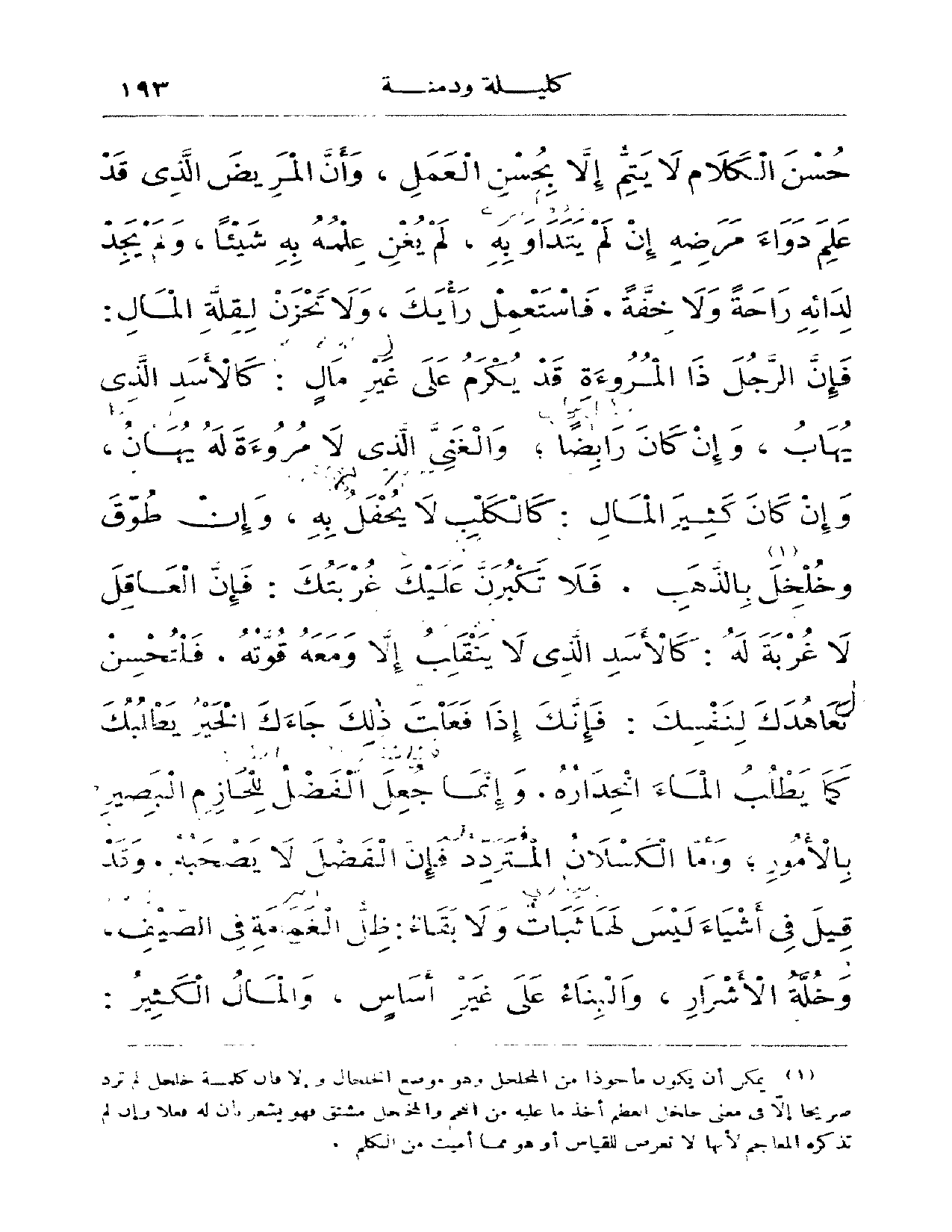 حسن الكلام لا يتم إلا بحسن العمل، وأن المريض الذي قد علم دواء مرضه إن يتداو به، لم يغن به شيئاً، ولم يجد لدائه راحة ولا خفةً. فاستعمل رأيك، ولا تحزن لقلة المال: فإن الرجل ذا المروءة قد يكرم على غير مال: كالأسد الذي يهاب، وإن كان رابضاً، والغني الذي لا مروءة له يهان وإن كان كثير المال: كالكلب لا يحفل به، وإن طوق وخلخل بالذهب. فلا تكبرنّ عليك غربتك: فإن العاقل لا غربة له: كالأسد الذي لا ينقلب إلا ومعه قوته. فلتحسن تعاهدك لنفسك: فإنك إذا فعلت ذلك جاءك الخير يطلبك كما يطلب الماء انحداره. وإنما جُعلَ الفضل للحازم البصير بالأمور، وأما الكسلان المتردد فإن الفضل لا يصحبه. وقد قيل في أشياء ليس لها ثباتٌ ولا بقاء: ظل الغمامة في الصيف، وخلة الأشرار، والبناء على غير أساس، والمال الكثير: