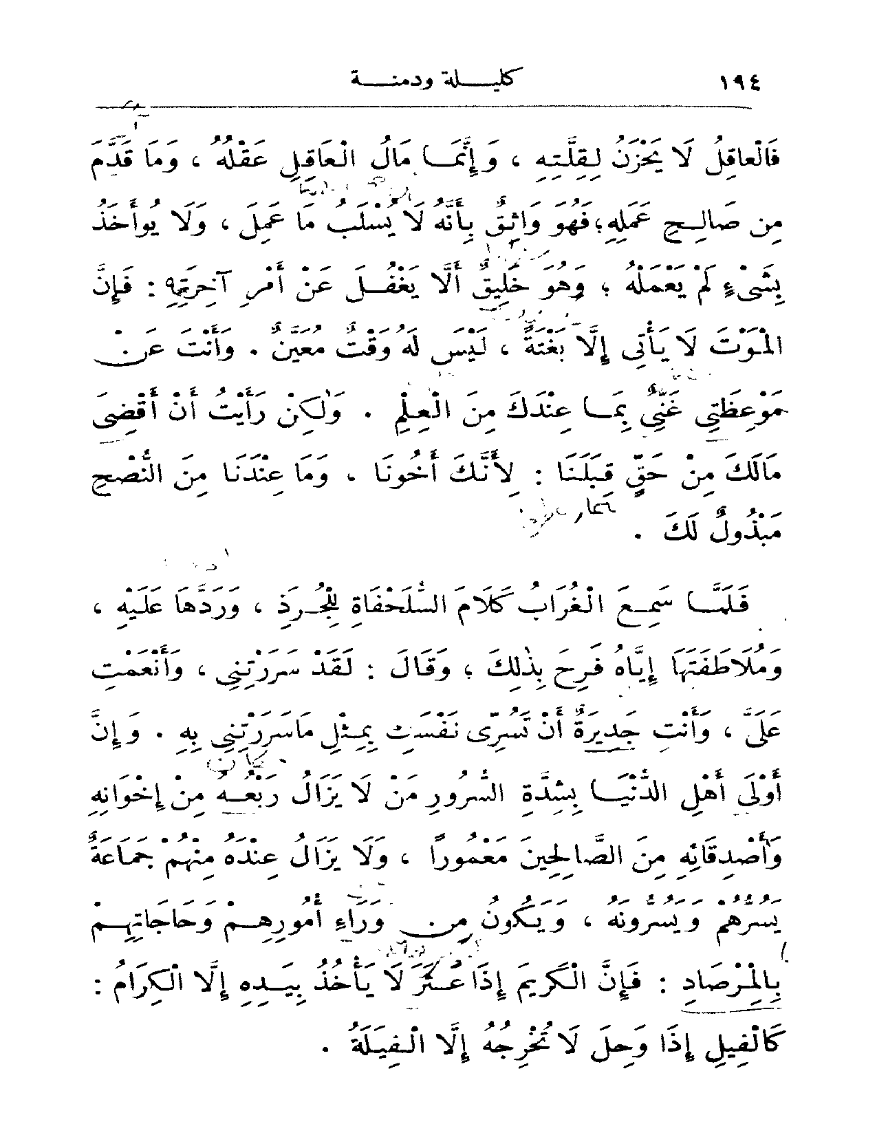 فالعاقل لا يحزن لقلته، وإنما مال العاقل عقله، وما قدّم من صالح، فهو واثق بأنه لا يسلب ما عمل ولا يوآخذ بشيءٍ لم يعمله، وهو خليق ألا يغفل عن أمر أخرته: فإن الموت لا يأتي إلا بغتةً، ليس له وقت معين. وأنت عن موعظتي غني بما عندك من العلم. ولكن رأيت أن أقضي مالك من حق قبلنا: لأنك أخونا وما عندنا من النصح مبذول لك. فلما سمع الغراب كلام السلحفاة للجرذ وردها عليه وملاطفتها إياه فرح بذلك وقال: لقد سررتني وأنعمت عليّ، وأنت جديرة أن تسرّي نفسك بمثل ما سررتني به. وإن أولى أهل الدنيا بشدّة السرور من لا يزال عنده منهم جماعة يسرهم ويسرونه، ويكون من وراء أمورهم وحاجاتهم بالمرصاد: فإن الكريم إذا عثر لا يأخذ بيده إلا الكرام: كالفيل إذا وحل لا تخرجه إلا الفيلة.