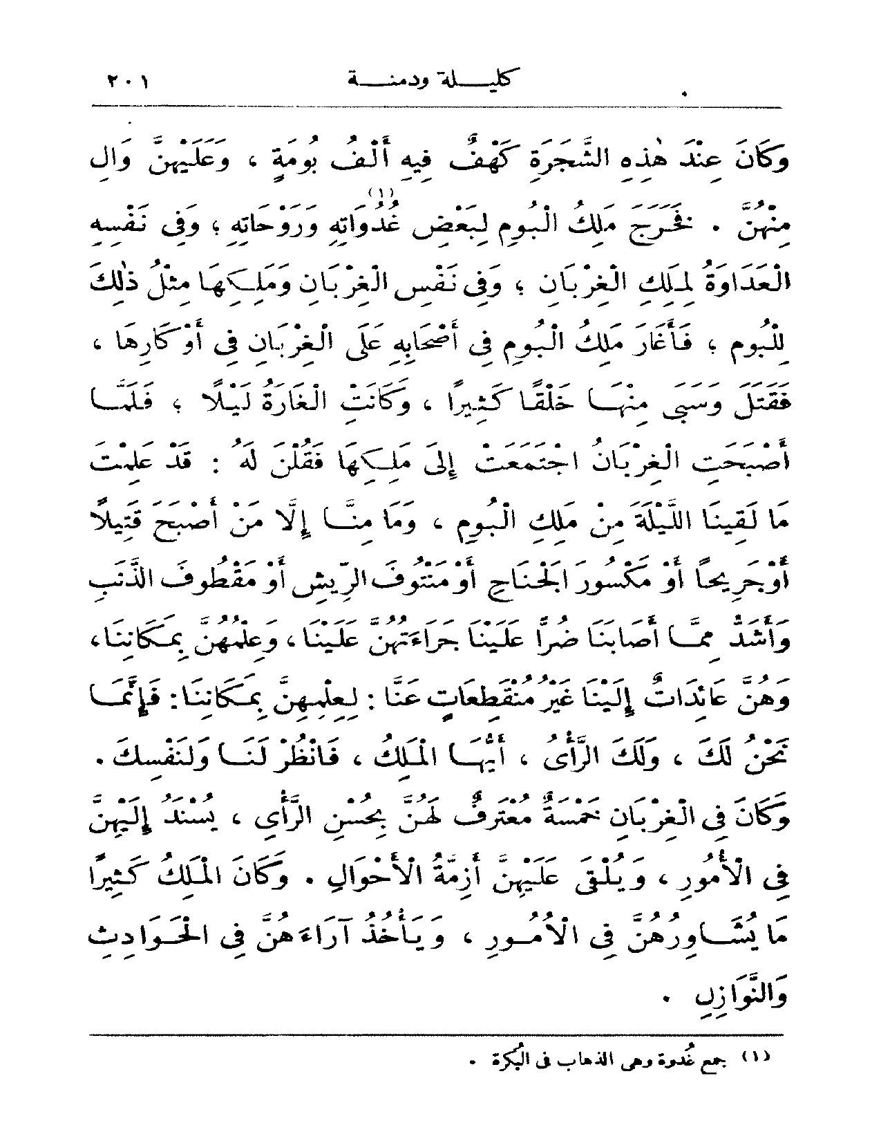 وكان عند هذه الشجرة كهف فيه ألف بوم، وعليهن والٍ منهن. فخرج ملك البوم لبعض غدواته وروحاته، وفي نفسه العداوة لملك الغربان، وفي نفس الغربان وملكها مثل ذلك للبوم، فأغار ملك البوم في أصحابه على الغربان في أوكارها، فقتل وسبى منها خلقاً كثيراُ، وكانت الغارة ليلاً، فلما أصبحت الغربان اجتمعت إلى ملكها فقلن له: قد علمت ما لقينا الليلة من ملك البوم، وما منّا لإلا أصبح قتيلاً أو جريحاً أو مكسور الجناح أو منتوف الريش أو مقطوف الذنب وأشد مما أصابنا ضراً علينا جراءتهن علينا، وعلمهن بمكاننا، وهنّ عائدات إلينا غير منقطعات عنّا: لعلمهنّ بمكاننا: فإنما نحن لك، ولك الرأي، أيها الملك، فانظر لنا ولنفسك، وكان في الغربان خمسة معترف لهن بحسن الرأي، يسند إليهنّ في الأمور، ويلقى عليهن أزمة الأحوال. وكان الملك كثيراً ما يشاورهن في الأمور، ويأخذ آراءهن في الحوادث والنوازل.