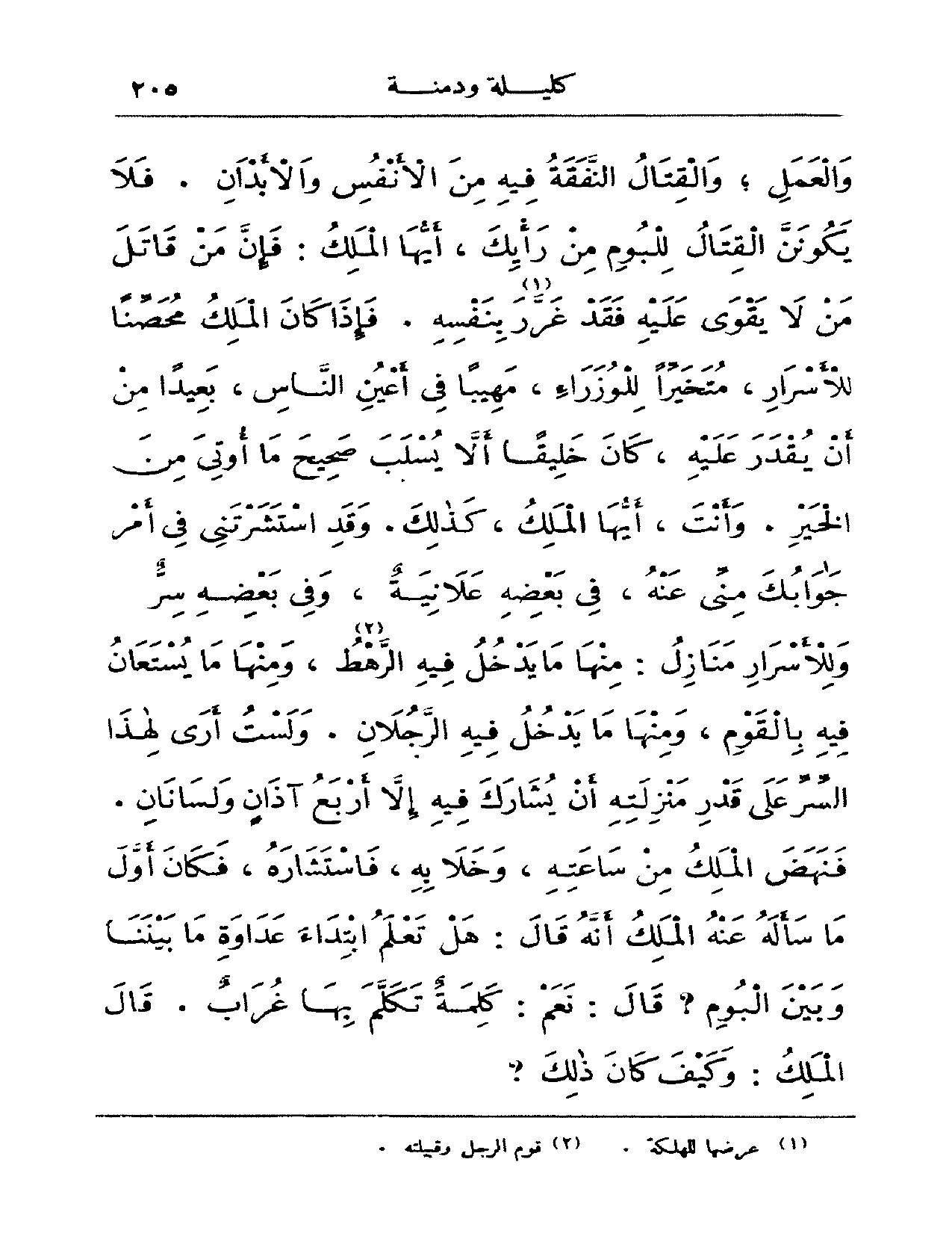 والعمل، والقتال النفقة فيه من الأنفس والأبدان. فلا يكونن القتال للبوم من رأيك، أيها الملك: فإن من قاتل من لا يقوى عليه فقد غرر بنفسه. فإذا كان الملك محصناً للأسرار، متخيراً للوزراء، مهيباً في أعين الناس، بعيداً من أن يقدر عليه، كان خليقاً ألا يسلب صحيح ما أوتى من الخير. وأنت، أيها الملك، كذلك. وقد استشرتني في أمر جوابك منّي عنه، في بعضه علانية، وفي بعضه سرٌ وللأسرار منازل: منها ما يدخل فيه الرهط، ومنها ما يستعان فيه بالقوم، ومنها ما يدخل فيه الرجلان. ولست أرى لهذا السر على قدر منزلته أن يشارك فيه إلا أربع آذانٍ ولسانان. فنهض الملك من ساعته، وخلا به، فاستشاره، فكان أول ما سأله عنه الملك أنه قال: هل يعلم ابتداء عداوة ما بيننا وبين البوم؟ قال: نعم: كلمة تكلم بها غراب. قال الملك: وكيف كان ذلك؟