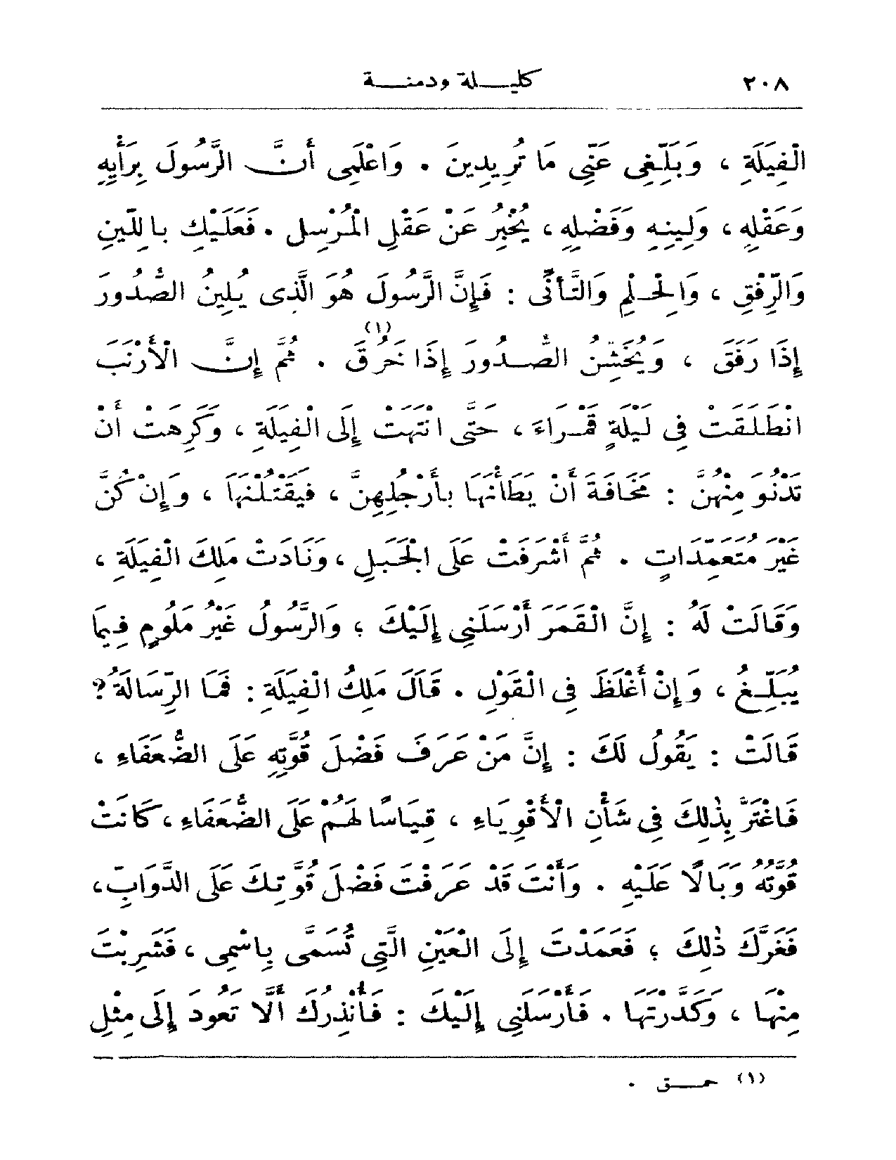 الفيلة، وبلغي عني ما تريدين. واعلمي أن الرسول برأيه وعقله، ولينه وفضله، يخبر عن عقل المرسل. فعليك باللين والرفق والحلم والتأني: فإن الرسول هو الذي يلين الصدور إذا رفق، ويخشن الصدور إذا خرق. ثم إن الأرنب انطلقت في ليلة قمراء، حتى انتهت إلى الفيلة، وكرهت أن تدنو منهن: مخافة أن يطأنها بأرجلهن، فيقتلنها، وإن كنّ غير متعمدات. ثم أشرفت على الجبل ونادت ملك الفيلة وقالت له: إن القمر أرسلني إليك، والرسول غير ملوم فيما يبلغ، وإن أغلظ في القول. قال ملك الفيلة: فما الرسالة؟ قالت: يقول لك: إن من عرف فضل قوته على الضعفاء، فاغتر بذلك في شأن الأقوياء، قياساً لهم على الضعفاء، كانت قوته وبالاً عليه. وأنت قد عرفت فضل قوتك على الدواب، فغرّك ذلك، فعمدت إلى العين التي تسمى باسمي، فشربت منها، وكدّرتها. فأرسلني إليك: فأنذرك ألا تعود إلى مثل