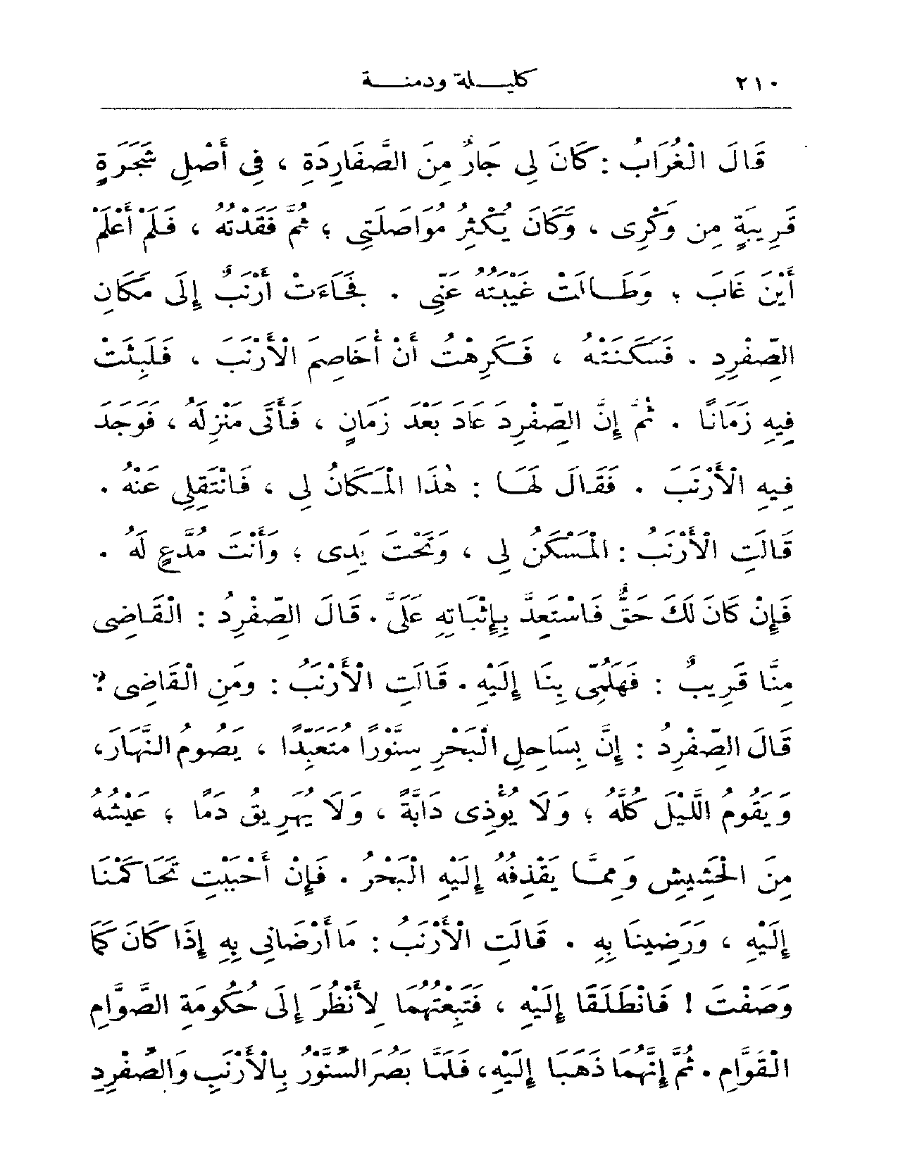 قال الصفرد: القاضي؟ منا قريب: إن بساحل البحر سنوراًمعبداً، يصوم النهار، ويقوم الليل كله، ولايؤذى دابة، ولا يهريق دماً، عيشه من الحشيش ومما يقذفه إليه البحر. فإن أحببت تحاكما إليه، ورضينا به. قالت الأرنب: ما أرضاني به إذا كان كما وصفت. فانطلقا إليه فتبعهما لأنظر إلى حكومة الصوام القوام ثم إنهما ذهبا إليه فلما بصر النور بالأرنب والصفرد
