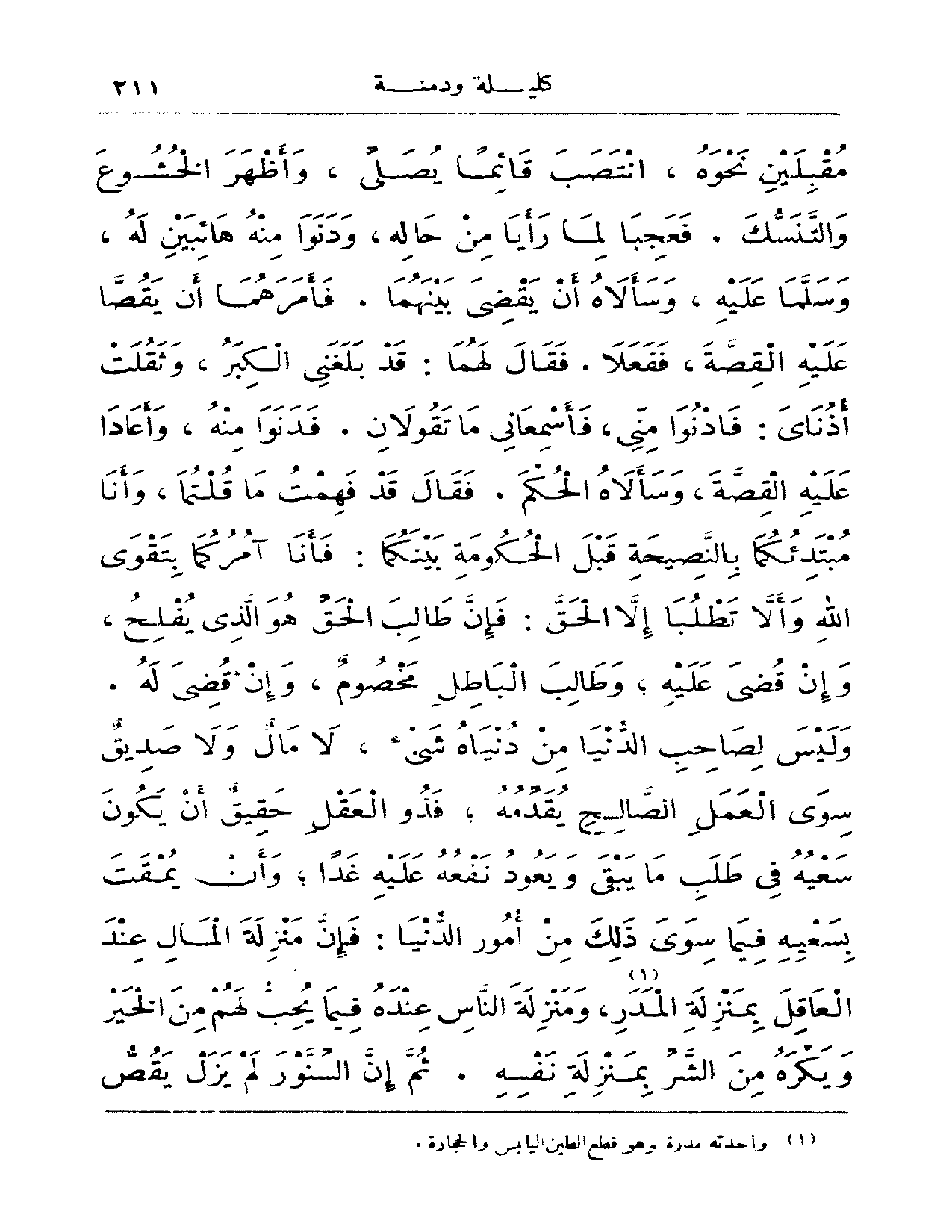 مقبيلين نحوه، انتصب قائماً يصلي، وأظهر الخشوع والتنسك. فعجبا لما رأيا من حاله ودنوا منه هائبين له، وسلما عليه وسألاه أن يقضي بينهما. فأمر هما أن يقصا عليه القصة ففعلا. فقال لهما: قد بلغني الكبر وثقلت أذناي: فادنوا مني فاسمعانى ما تقولان. فدنوا منه، وأعادا عليه القصة وسألاه الحكم فقال قد فهمت ما قلتما، وأنا مبتدئكما بالنصيحة قبل الحكومة بينكما: فأنا آمركما بتقوى الله وألاتطلبا إلا الحق هو الذي يفلح، وأن قضى عليه وطالب الحق هو الذي يفلح وإن قضى عليه وطالب الباطل مخصوم وإن قضى له. وليس لصاحب الدنيا من دنياه شئ لا مال ولا صديق سوى العمل الصالح يقدمه فذو العقل حقيق أن يكون سعيه في طلب ما يبقى وعود نفعه عليه غداً، وأن يمقت بسعيه فيما سوى ذلك من أمور الدنيا: فإن منزلة المال عند العاقل بمنزلة المدر، ومنزلة الناس عنده فيما يحب أهم من الخير ويكره من الشر بمنزلة نفسه. ثم إن السّنّور لم يزل يقصّ