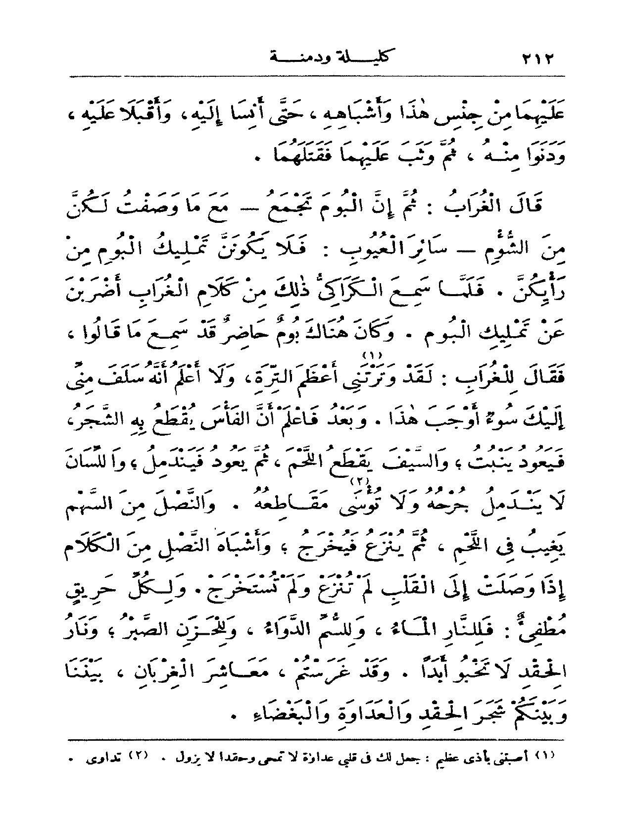 عليهما من جنس هذا وأشباهه، حتى أنسا إليه، وأقبلا عليه، ودنوا منه، ثم وثب عليهما فقتلهما. قال الغراب: ثم إن البوم تجمع مع ما وصفت لكن من الشؤم سائر العيوب: فلا يكونن تمليك البوم من رأ يكن. فلما سمع الكراكى ذلك من كلام الغراب أضربن عن تمليك البوم. زكان هناك بوم حاضر قد سمع ما قالوا، فقال الغراب: لقد وترتني أعظم الترة، ولا أعلم أنه سلف مني إليك سوءٌ أوجب هذا. وبعد فاعلم أن الفأس يقطع به الشجر فيعود ينبت السيف يقطع اللحم ثم يعود فيندمل واللسان لا يندمل جرحه ولا تؤسى مقاطعه. والنصل من السهم يغيب في اللحم ثم ينزع فيخرج، وأشباه النصل من الكلام إذا وصلت إلى القلب لم تنزع ولم تستخرج. ولكل حريق مطفئٌ: فللنار الماء، وللسم الدواء وللحزن الصبر ونلر الحقد لا تخبو أبداً. وقد غرستم معاشر الغربان بيننا وبينكم شجر الحقد والعداوة والبغضاء.