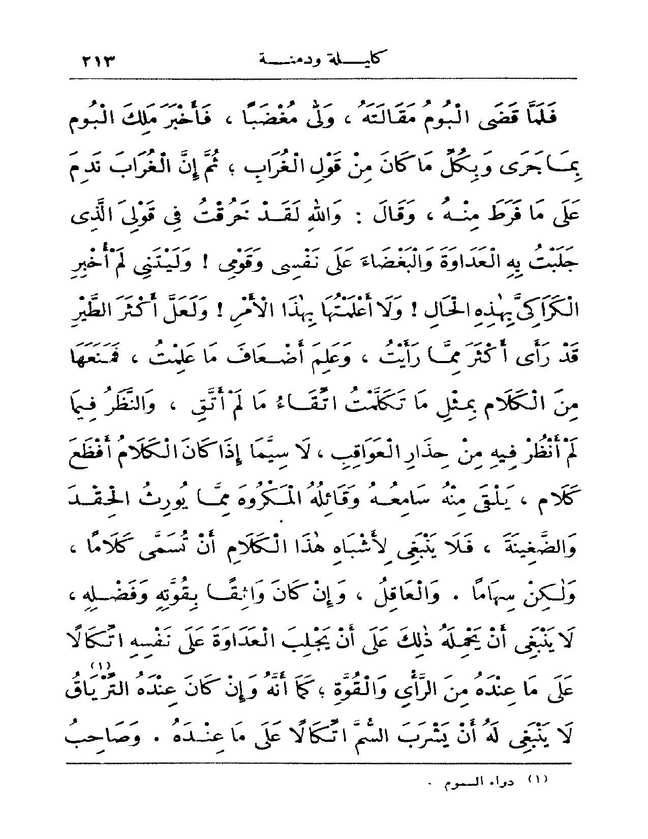 فلما قضى البوم مقالته، ولىّ مغضباً، فأخبر ملك البوم بما جرى وبكل ما كان منقول الغراب، ثم إن الغراب ندم على ما فرط منه، وقال: والله لقد خرقت في قولي الذي جلبت به العداوة والبغضاء على نفسي وقومي! وليتني لم أخبر الكراكي بهذه الحال! ولا أعلمتها بهذا الأمر! ولعل أكثر الطير قد رأى أكثر مما رأيت، وعلم أضعاف ما علمت، فمنعها من الكلام بمثل ما اتقاء ما لم أتق، والنظر فيما لم أنظر فيه من حذار العواقب، لا سيما إذا كان الكلام أفظع كلام، يلقى منه سامعه وقائله المكروه مما يورث الحقد والضغينة، فلا ينبغي لأشباه هذا الكلام، أن تسمى كلاماً، ولكن سهاماً. والعاقل، وإن كان واثقاً بقوته وفضله، لا ينبغي أن يحمل ذلك على أن يجلب العداوة على نفسه اتكالاً على ما عنده من الرأي والقوة، كما أنه وإن كان عنده الترياق لا ينبغي له أن يشرب السم اتكالاً على ما عنده. وصاحب
